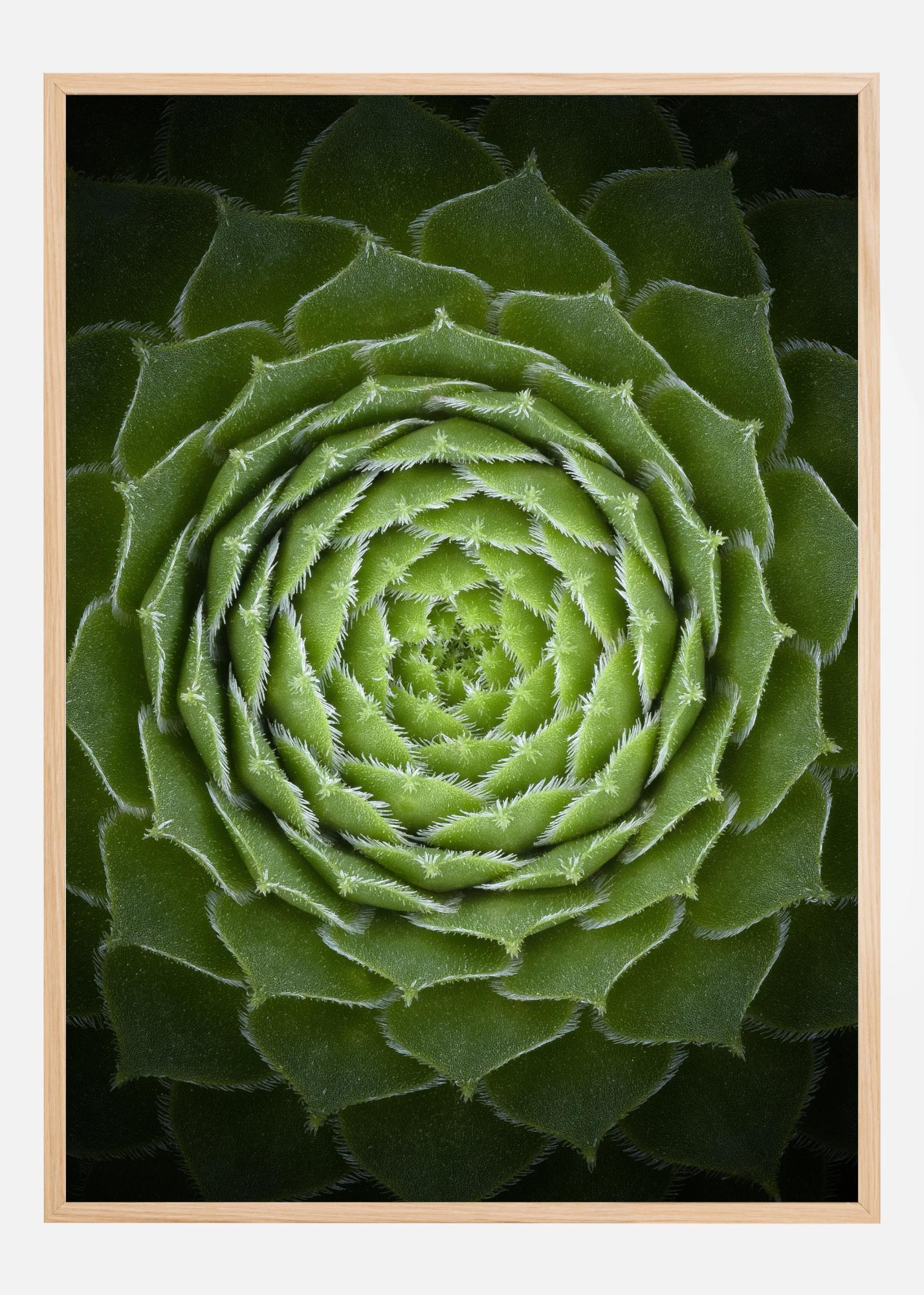 Un póster de primer plano con una verdura jugosa. Hojas verde claro se despliegan en un diseño en forma de rosa. Las puntas de cada hoja en la rosa tienen detalles nítidos y pequeñas espinas blancas se pueden ver cuando se mira dentro de cada anillo de esta planta verde vívido.