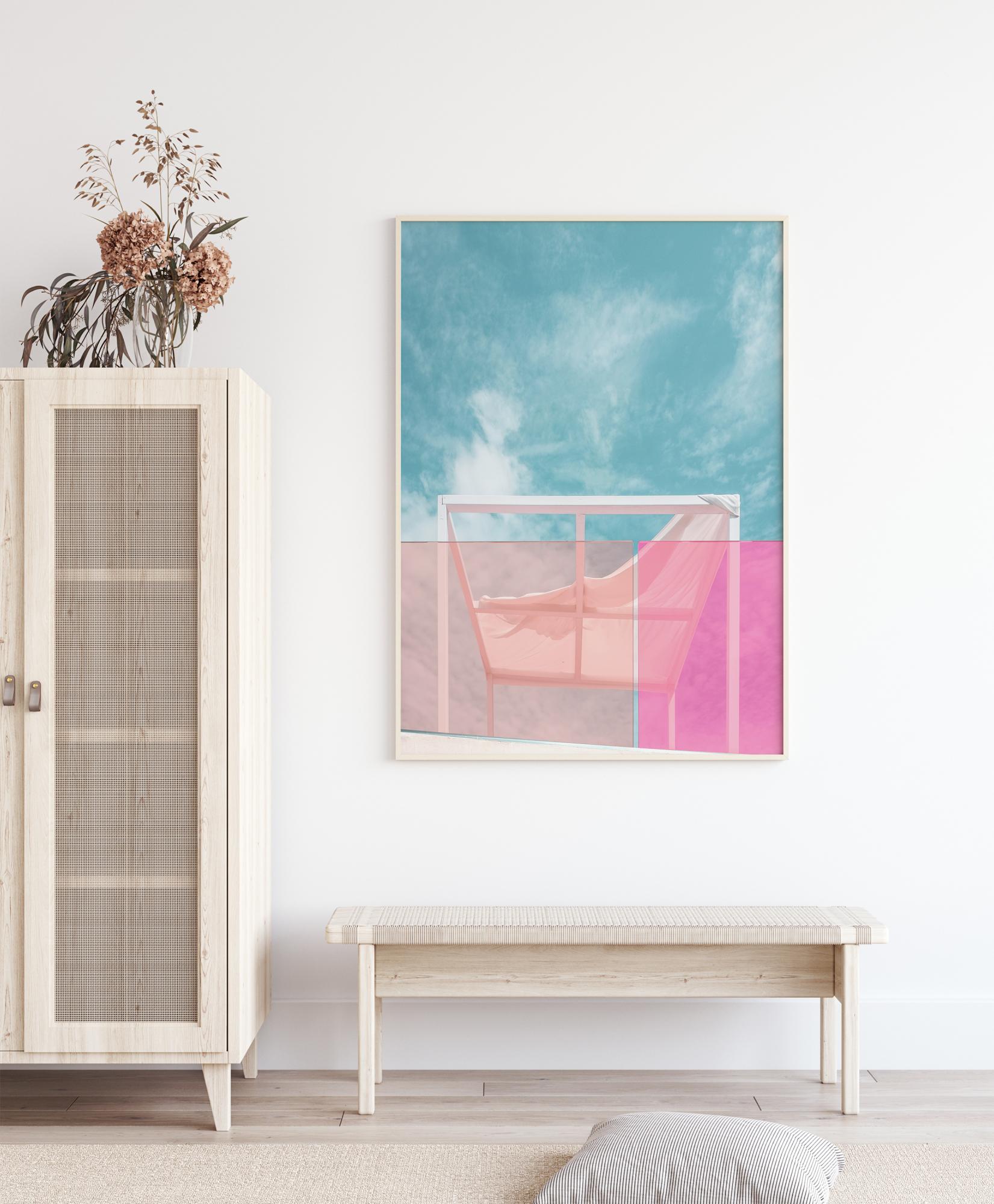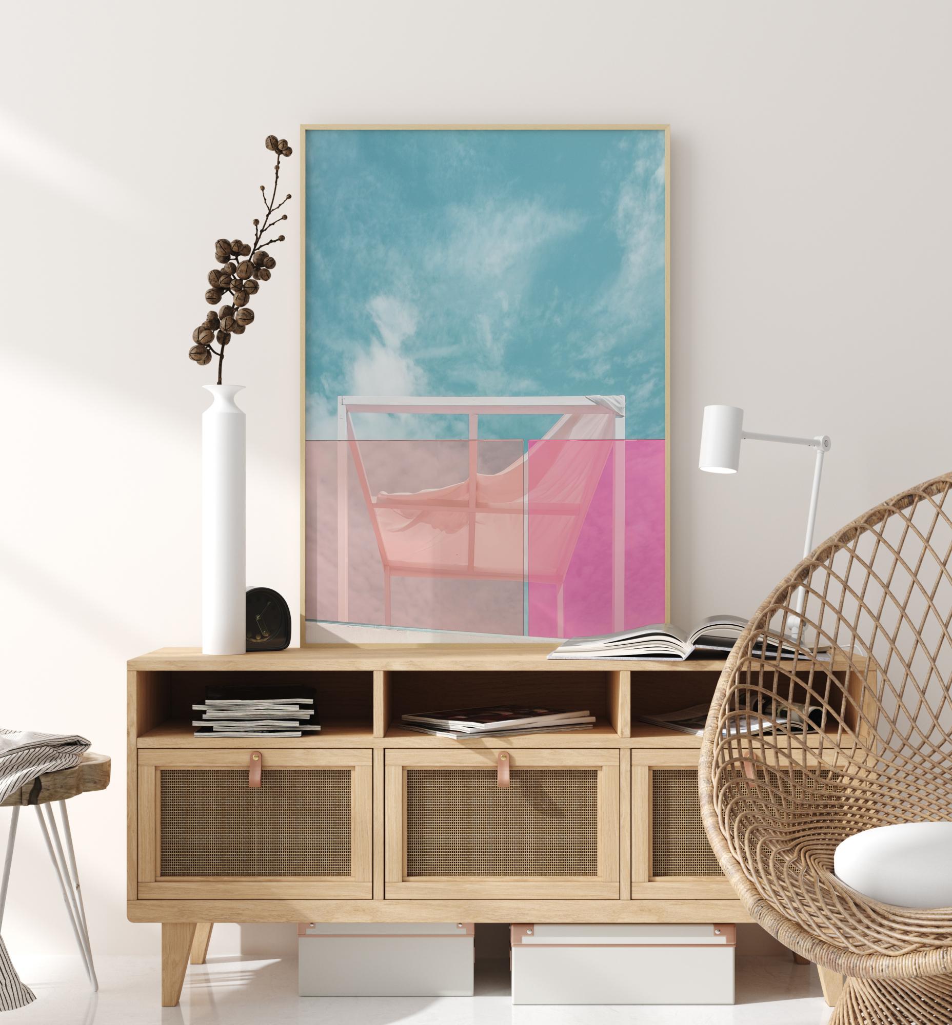 Un póster colorido con un cielo de verano y un techo solar. A través de los cristales rosados ??del balcón se puede ver el techo blanco y las suaves nubes blancas en el cielo azul. Imagínate tomar el sol aquí en el techo en un caluroso día de verano.