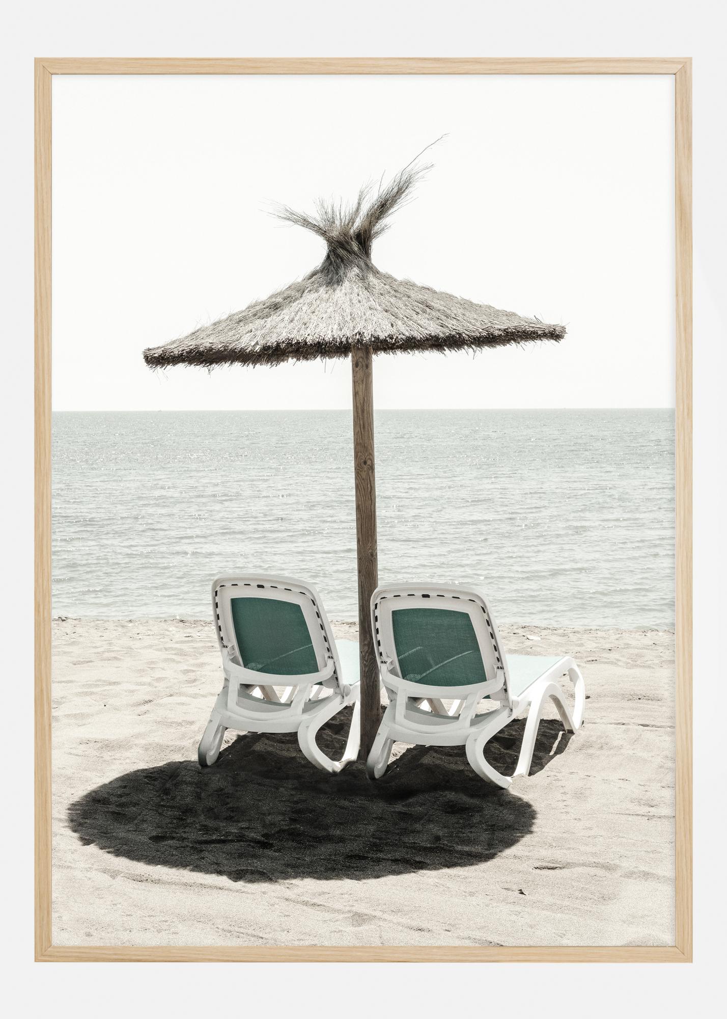 Déjate llevar por el sonido de las olas y la sensación de la arena cálida con este póster relajante. Dos sillas de playa vacías bajo una sombrilla de paja esperan invitadoramente en la playa, con el horizonte del mar de fondo. Esta escena tranquila es una expresión de relajación y una escapatoria de la vida cotidiana.