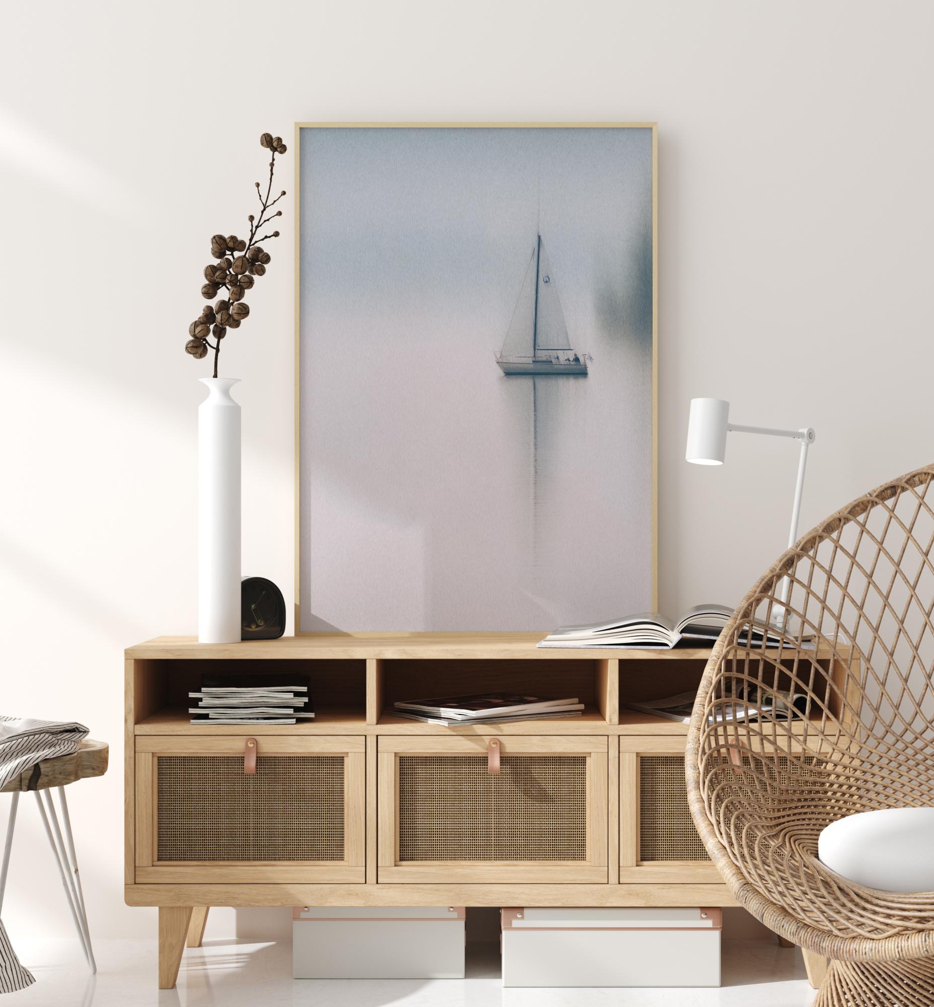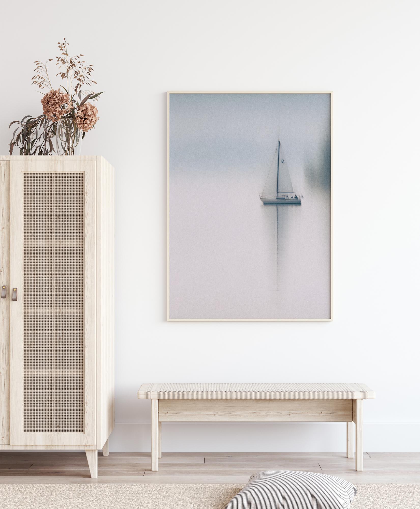 Un póster relajante de un yate en medio de un lago blanco. La imagen es suave con bordes borrosos en todas las figuras. Las velas del barco se extienden sobre el agua mientras se desliza en la niebla azul claro y gris en una mañana de domingo temprano.