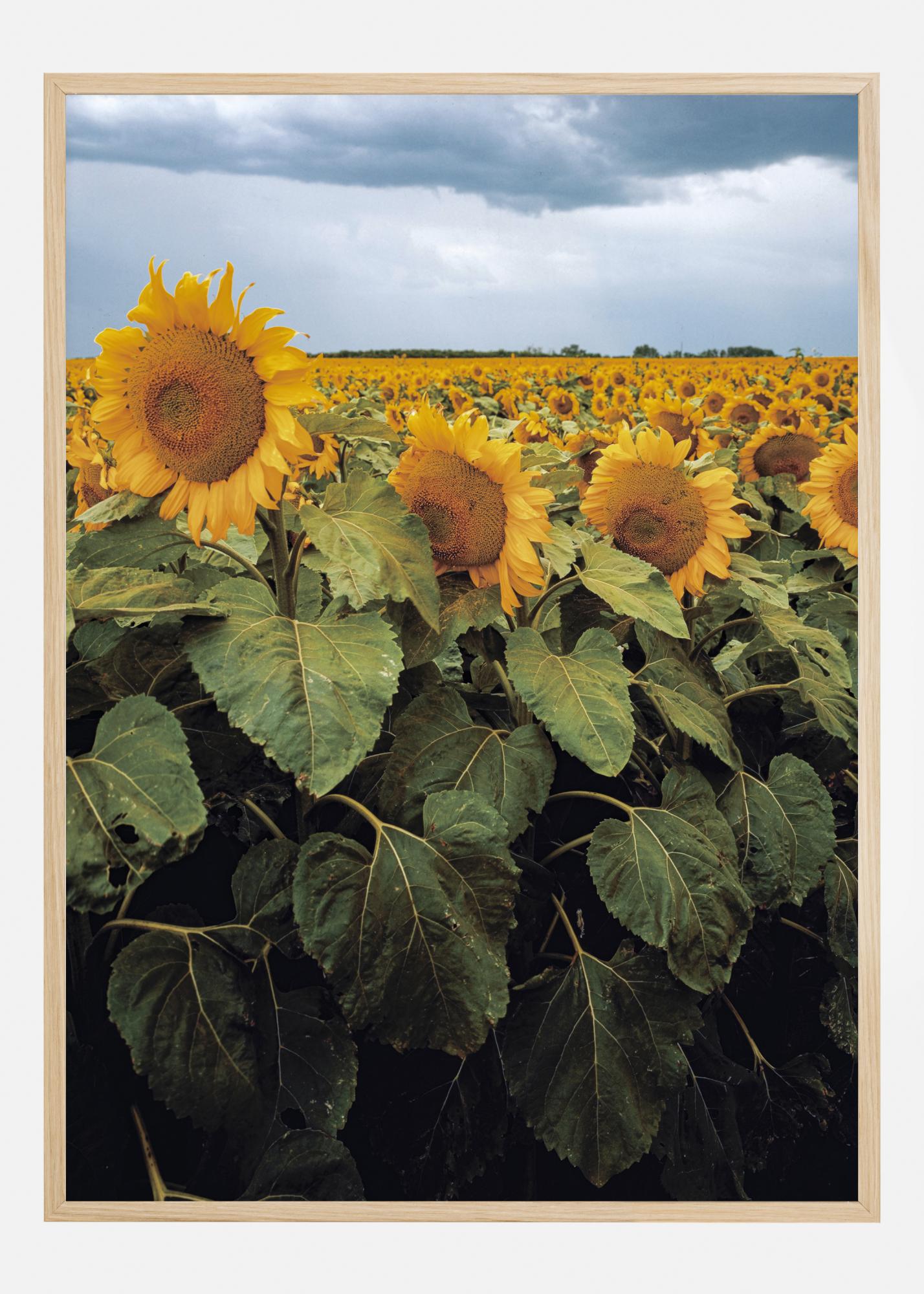 Un fascinante póster con un gran campo de girasoles. La imagen está llena de los largos tallos verdes y hojas de las flores. En la parte superior flota un mar de girasoles de color amarillo claro que se extienden hacia el horizonte y el cielo azul. Siéntete elevado con esta alegre impresión.