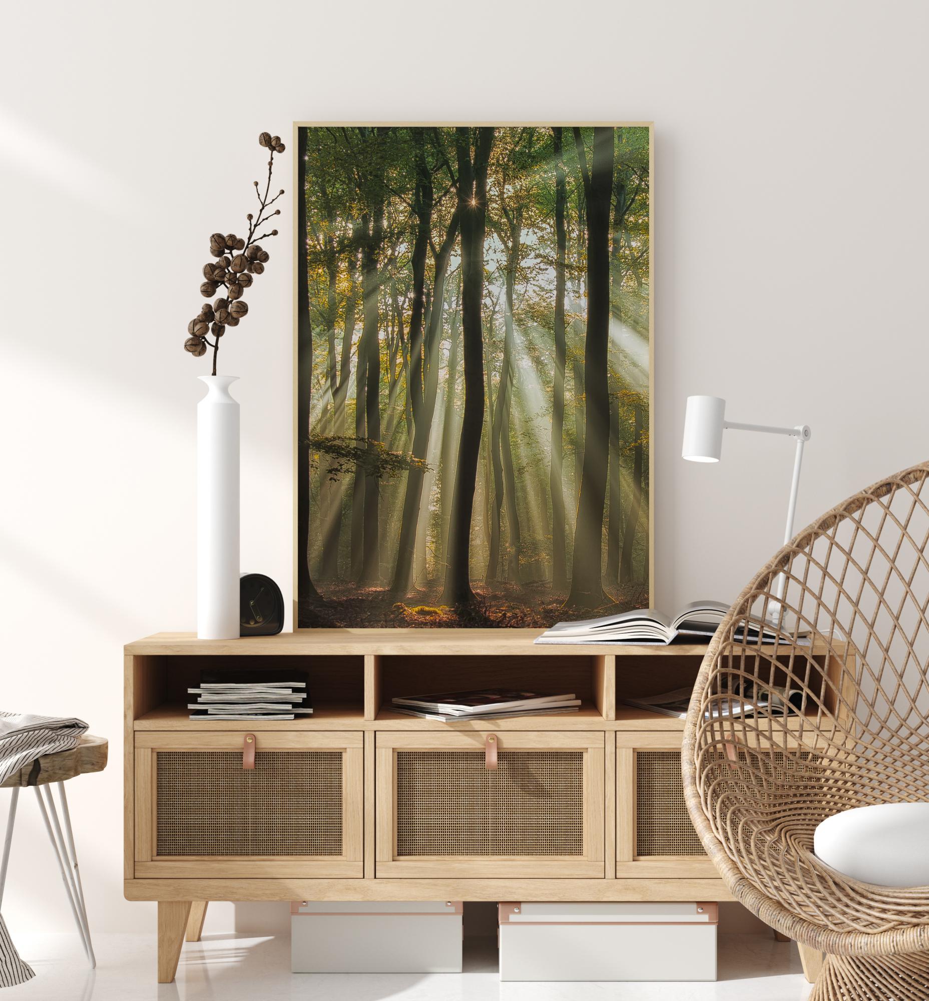Un paisaje forestal con rayos de sol que se filtran entre los altos troncos de los árboles. Los largos troncos dirigen la mirada hacia arriba a través de la imagen. Como una estrella, el sol brilla en la parte superior a través de una apertura y arroja suaves rayos a través de los árboles, iluminando el bosque con un suave resplandor verde. Imagina dar un paseo por este tranquilo bosque.