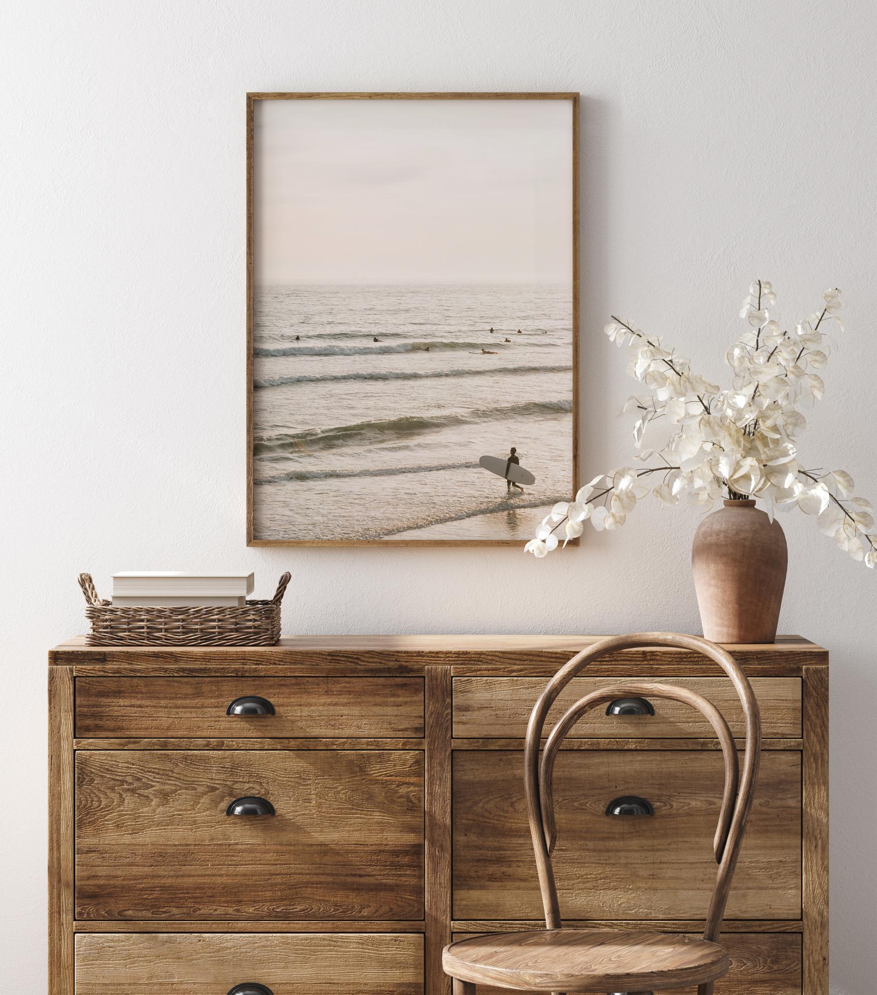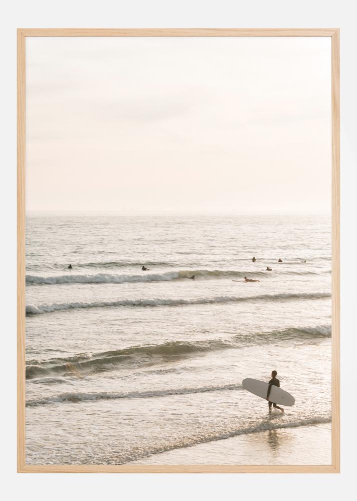 Un póster con un mar extenso lleno de surfistas esperando la próxima gran ola. Pequeñas cabezas flotan lejos en el mar y un último surfista camina entre las olas con su tabla. El mar está tranquilo en la suave luz de la mañana y hay una sensación de anticipación en el aire.