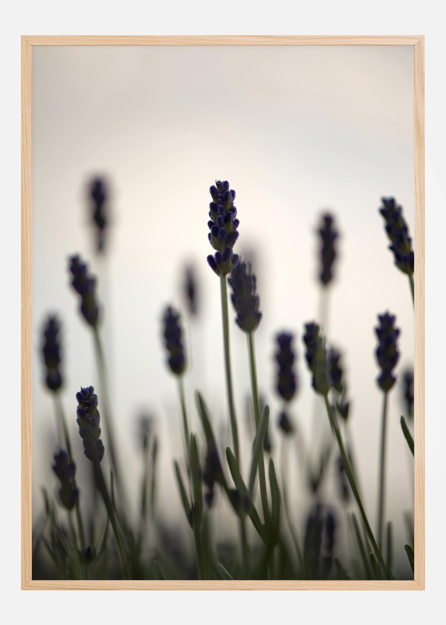 Un póster de flores con un primer plano de flores de lavanda en un campo. Si miras de cerca, puedes ver los capullos lilas ondeando en la parte superior de los tallos verdes. Se mantienen rectos contra un fondo blanco sencillo, el complemento perfecto para una habitación colorida.