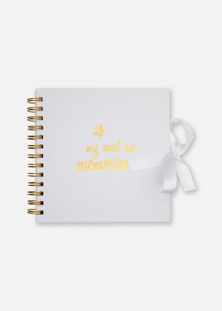 Un álbum encuadernado en espiral muy dulce que puedes cerrar con ayuda de cintas blancas. ¡Un álbum perfecto para guardar todos tus mejores recuerdos! En la portada, el texto "My sweet memories", (Mis dulces recuerdos), está impreso en dorado rodeado de mariposas. El álbum contiene 24 hojas blancas libres de ácido.
