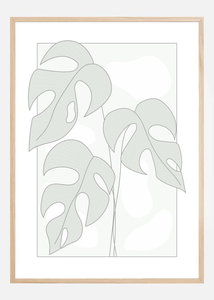 Un póster sencillo con ilustrativas hojas de monstera. Tres hojas grandes llenan la imagen, cada una en un tono gris suave. Líneas más finas forman los tallos cuando estas elegantes hojas con agujeros cuelgan en esta imagen. Manténlo discreto colgándolo en una pared verde suave para una sensación natural.