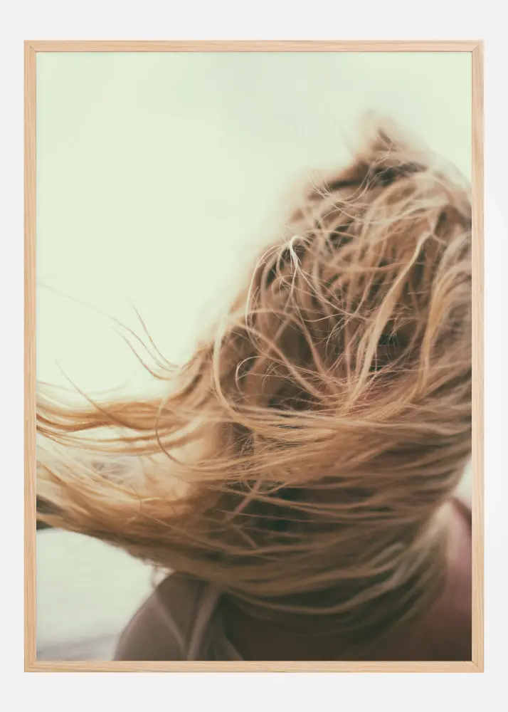 Un retrato sencillo de una niña de cabello claro en el viento. Su cabello sopla sobre su rostro y lo oculta, pero si miras de cerca puedes ver un ojo que te mira de vuelta. Acompaña a esta niña al aire libre mientras disfrutas de esta impresión cautivadora.