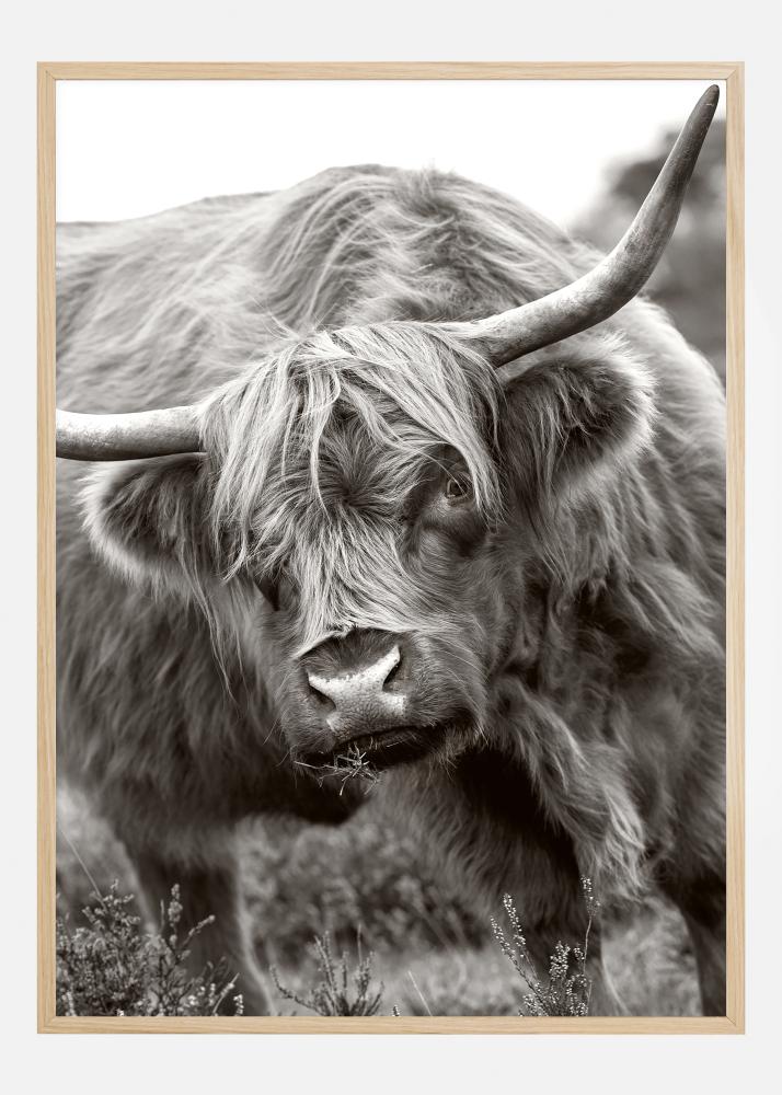 Un póster de animales con un toro de las tierras altas. El toro se inclina hacia la imagen con el pelaje colgando sobre los ojos. Un ojo mira hacia la cámara y su suave y peluda piel captura la luz cuando se mueve. A pesar de los cuernos, la cara del animal es suave y encantadora, casi se puede sentir el hocico húmedo.