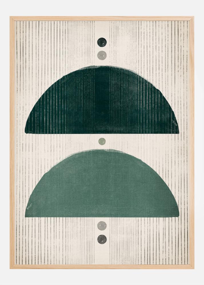 Este póster es más que solo una imagen decorativa; es una interpretación artística contemporánea que une lo natural con lo estilizado. Las tres formas circulares, centradas entre los bloques semicirculares, funcionan como un punto focal que une toda la composición. Esta impresión podría servir como un elegante elemento de pared en un hogar o una oficina minimalista, y los tonos verdes calmantes aportarían una sensación de naturaleza y tranquilidad a cualquier entorno.