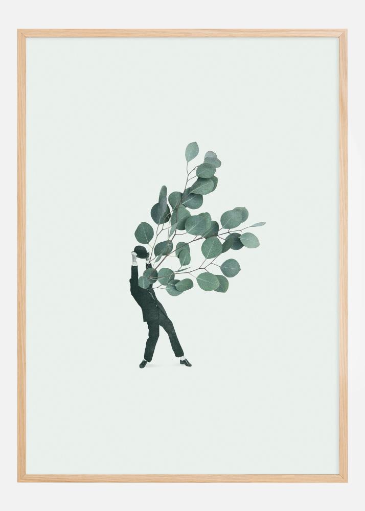 Este póster artístico y elegante presenta una silueta minimalista de una persona que lleva un exuberante ramo de hojas de eucalipto, una expresión visual que es tan simple como poderosa. El contorno negro de la figura contra el fondo claro contrasta fuertemente con los suaves tonos verdes de las hojas de eucalipto, creando una sensación de naturaleza pacífica en armonía con la presencia humana.