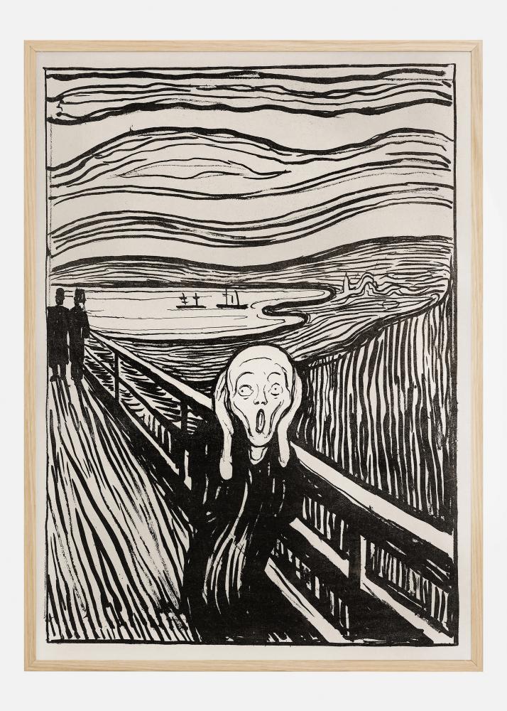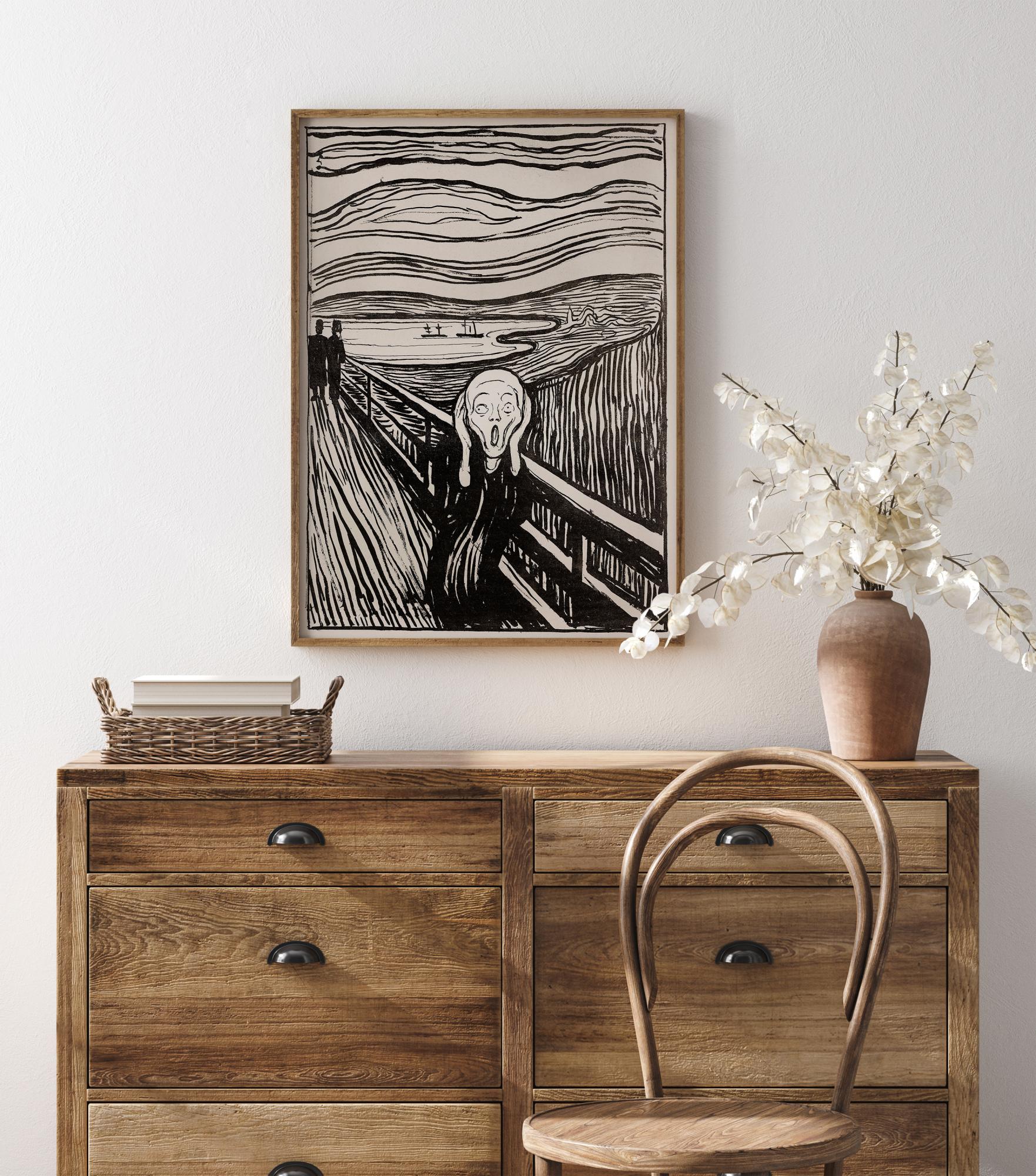 Un póster expresionista abstracto de El Grito de Edvard Munch en blanco y negro. Esta es una impresión icónica en blanco y negro que todos reconocen de inmediato, que se centra en el rostro blanco y gritante de la persona en el puente. Muestra tus conocimientos artísticos con esta imagen clásica en una pared colorida en casa.