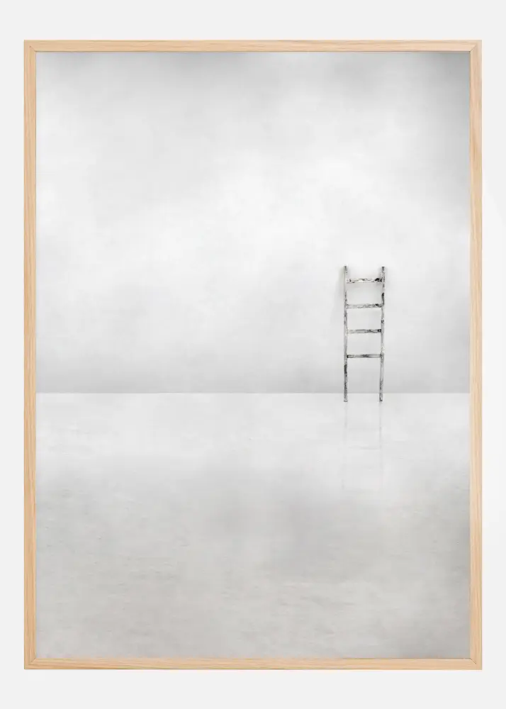 Un póster minimalista con una escalera apoyada en un fondo blanco. Esta solitaria escalera, llamada la escalera social, también está colocada sobre un suelo blanco. Tanto la pared como el suelo están en los mismos tonos blancos y grises, lo que hace que la escalera se destaque en tonos más oscuros. Diviértete interpretando el significado de esta imagen.