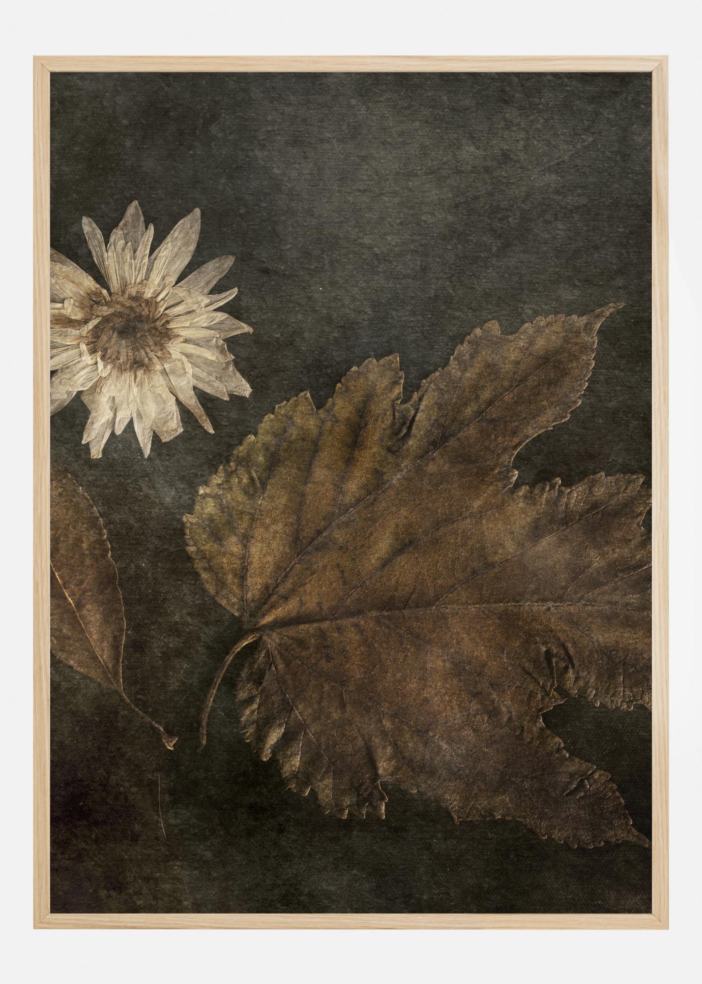 Un póster de flores con una flor sencillo con dos hojas. La flor blanca en forma de estrella llama la atención mientras se destaca en el fondo gris oscuro. Dos hojas de otoño marrones flanquean la flor, una sencillo y ovalada y otra más intrincada en forma de higo. Mira de cerca para apreciar los detalles de las hojas y los pétalos en esta impresión botánica fantástica.