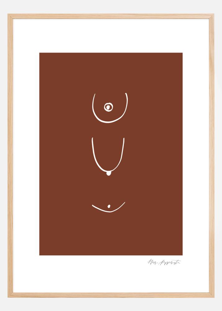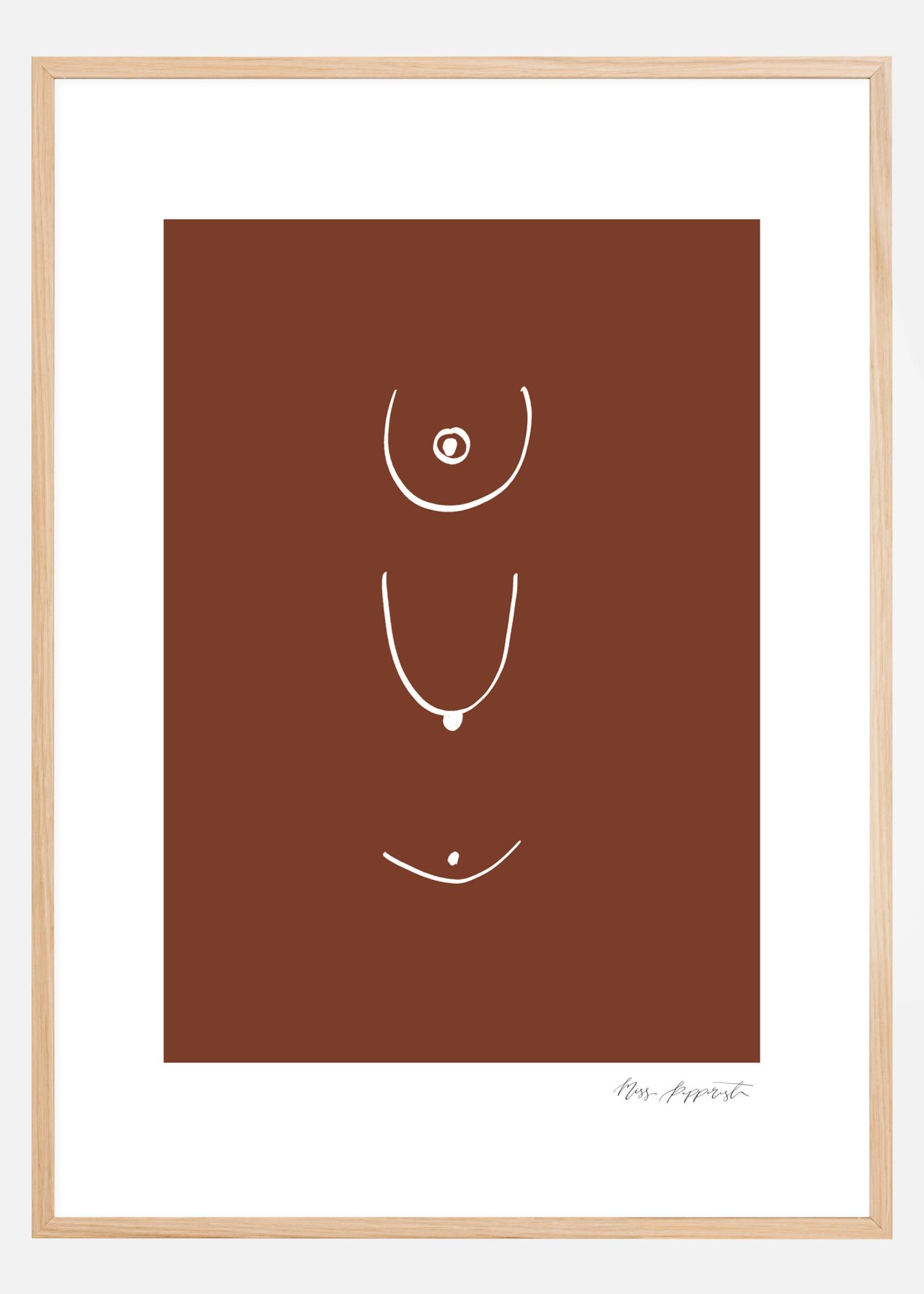 Un póster abstracto con líneas curvas y puntos blancos sobre un fondo marrón sencillo. Las líneas pueden interpretarse de diferentes maneras, pero parecen ser dibujos de pechos de mujer desde diferentes ángulos. Disfruta de la peculiaridad de esta imagen sencilla.