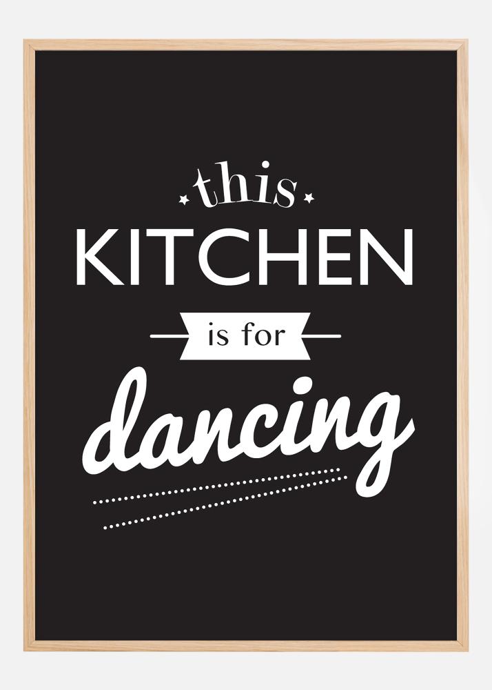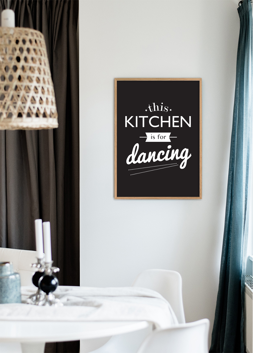 Todos saben que la cocina es el corazón del hogar. Es donde amigos y familiares se reúnen para celebraciones, fiestas y acogedoras cenas de fin de semana. Además, la mayoría de los suelos de cocina son ideales para momentos de baile salvaje. Este elegante póster añade una sensación encantadora a tu cocina y te anima cuando tienes que ocuparte de los aburridos platos. This Kitchen is for Dancing tiene un fondo negro y una impresión blanca en forma de figuras y patrones junto con el texto "This kitchen is for dancing". Cada palabra está impresa con una fuente de letra propia que le da una impresión juguetona. Cuélgalo tal cual o complementa con un marco llamativo. ¡Elige entre 6 formatos diferentes!