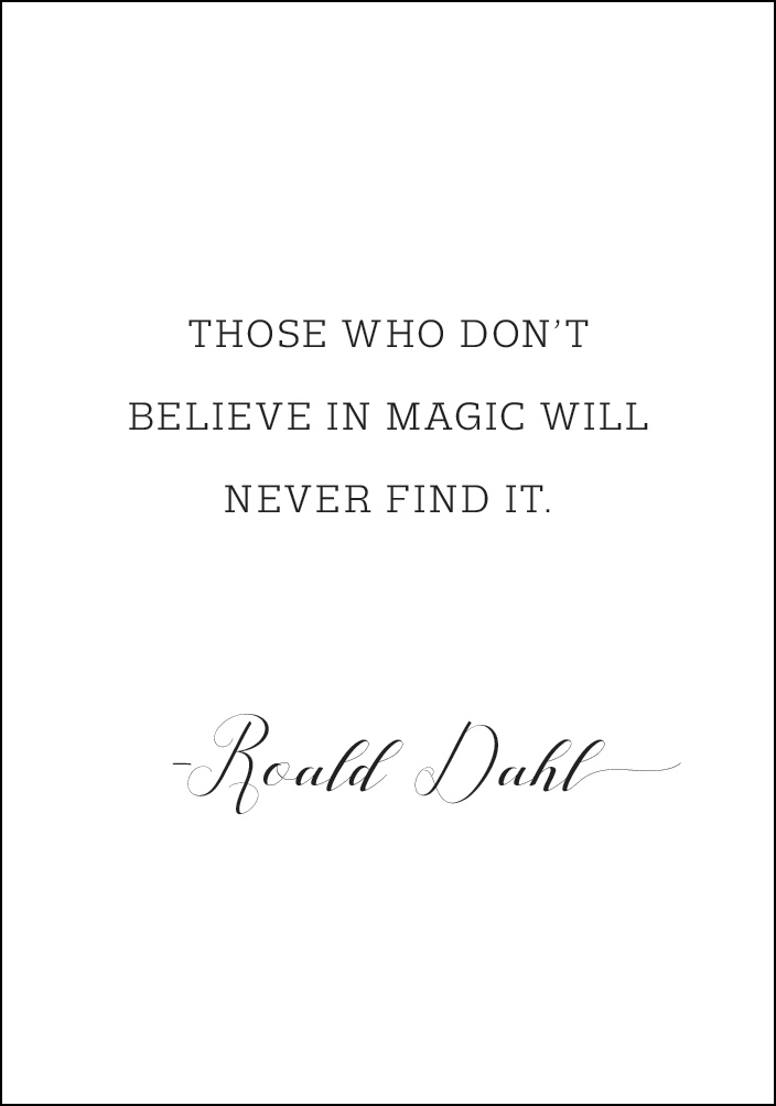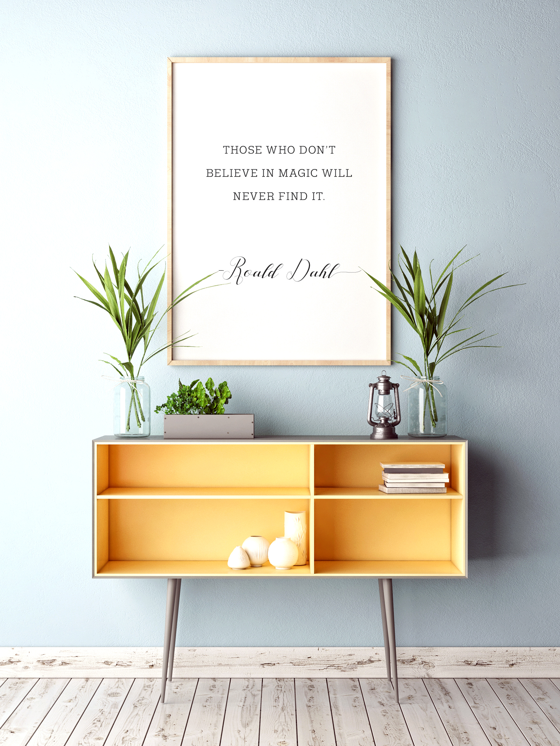 Un divertido póster de inspiración con una famosa cita del autor Roald Dahl. La cita "Those Who Don't Believe in Magic Will Never Find It", (Aquellos que no creen en la magia nunca la encontrarán), está escrita en una fuente de máquina de escribir de fácil lectura con el nombre del autor en cursiva debajo. La sencilla frase en negro resalta sobre el fondo blanco como un recordatorio de vivir cada día.