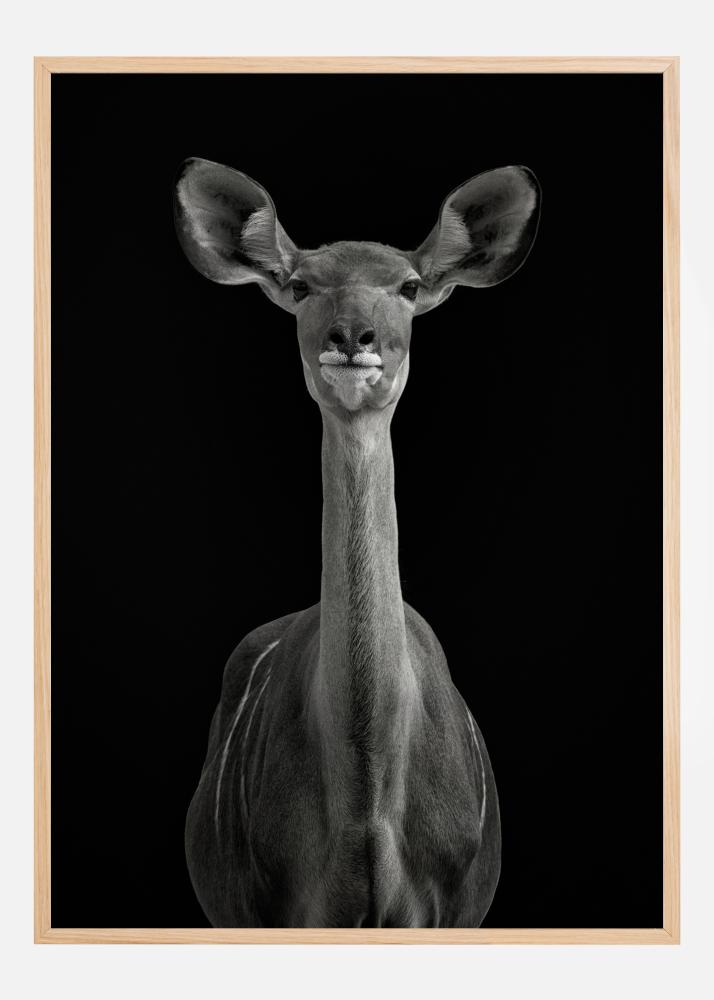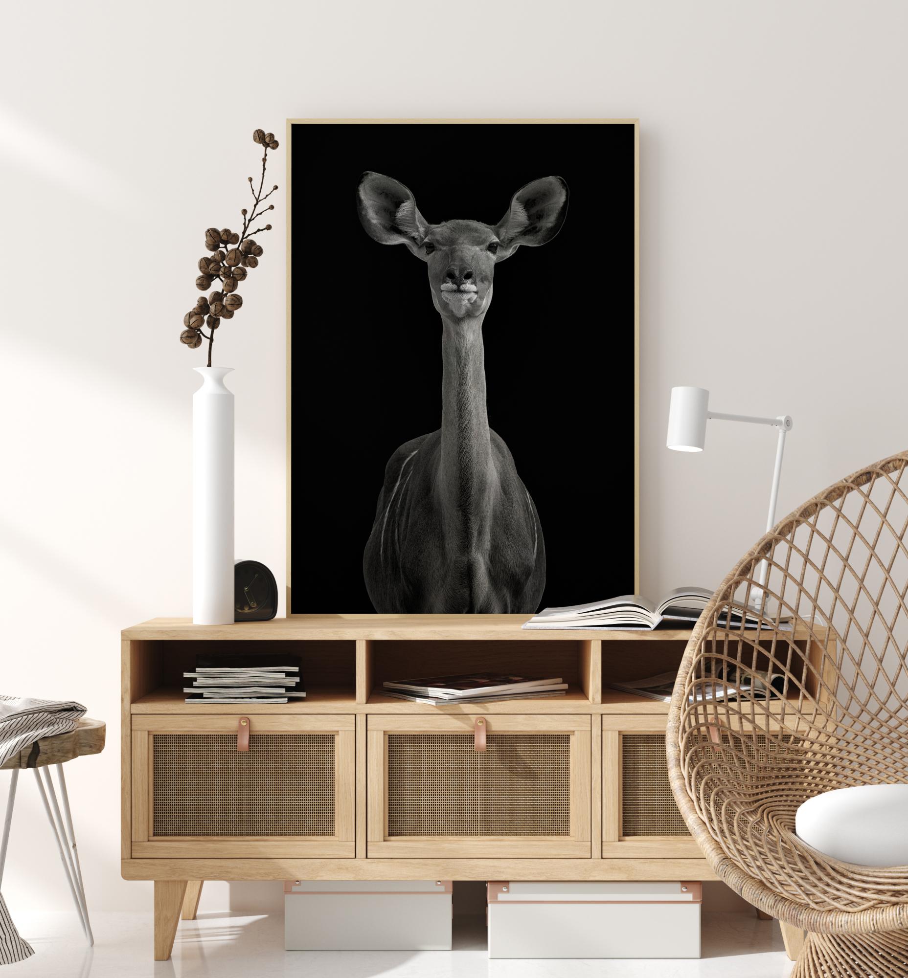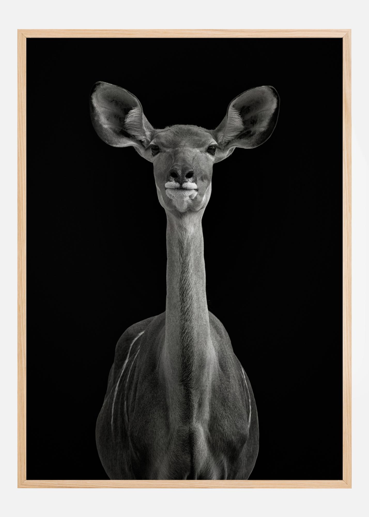 Un retrato fantástico de un antílope sobre un fondo negro profundo. El antílope se voltea hacia la cámara, con las orejas puntiagudas hacia adelante mientras mira y escucha. Su cuello es largo y fino y sus ojos son suaves. Combínalo con otra impresión de animal para crear una sensación zoológica fantástico.