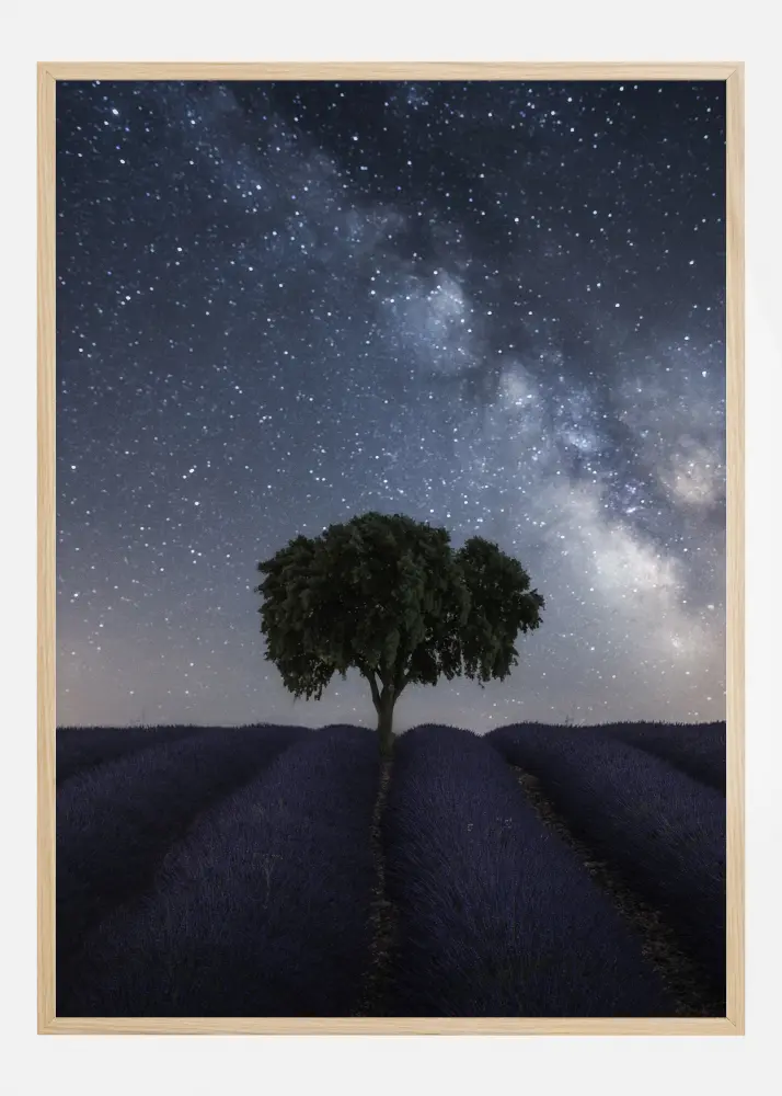Un póster espacial con un cielo estrellado con la Vía Láctea brillando sobre un árbol solitario. Líneas de lavanda guían el camino hacia el árbol que se encuentra solo contra el horizonte azul. La galaxia atraviesa el póster por encima del árbol y atrae la mirada hacia el cielo, creando una sensación mágica y épica.