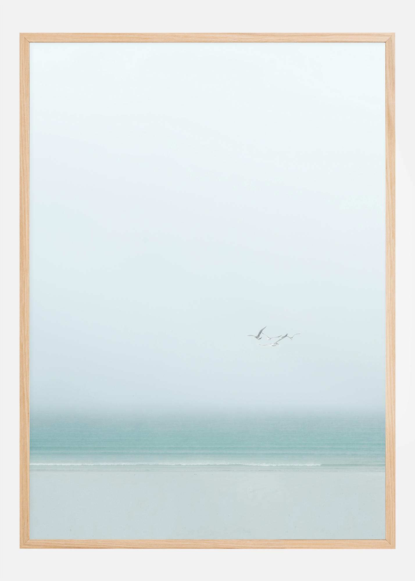 Un póster sencillo con dos pájaros volando sobre el mar. En el fondo, tanto el mar como el cielo son tan suaves, blancos y azules que es difícil ver dónde comienza uno y termina el otro. Los colores son tranquilizadores y solo el movimiento de los dos pájaros es un deleite para el ojo en este elegante pero sencillo póster.