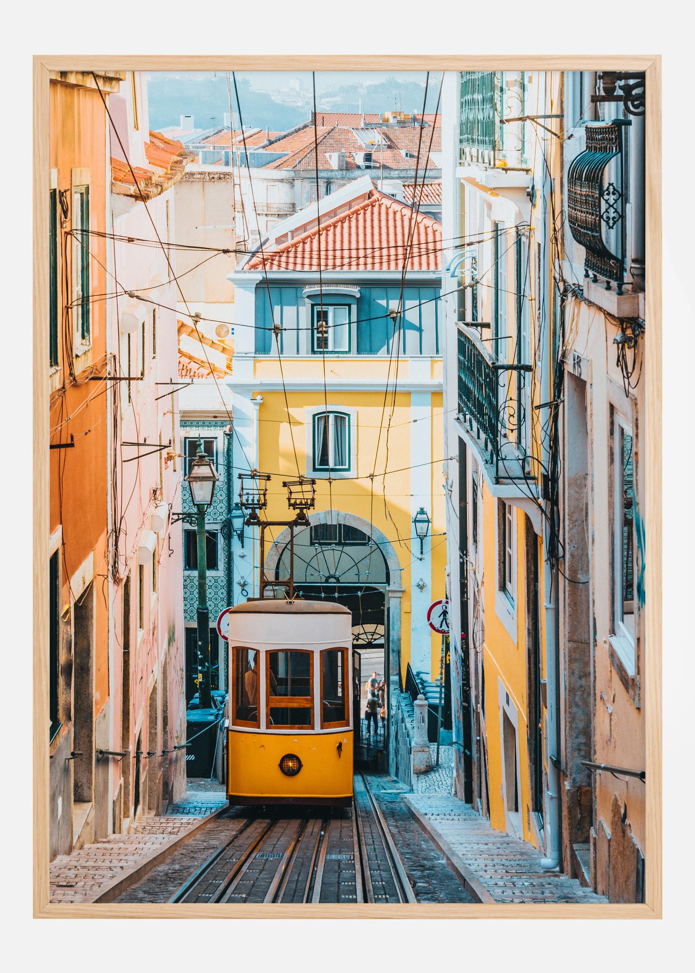 Este colorido y pintoresco póster representa el encantador y animado ambiente de una calle de ciudad europea, llena de historia y magia cotidiana. En primer plano vemos un clásico tranvía amarillo, un símbolo icónico del transporte público de la ciudad, que se mueve tranquilamente por las estrechas calles flanqueadas por arquitectura tradicional en tonos cálidos de amarillo y rojo. Este cartel es como una apertura a otro mundo y nos invita a subir y descubrir los secretos de la ciudad.