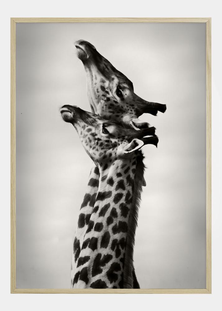 El póster muestra un encantador momento entre dos jirafas que parecen compartir una interacción tierna, sus cuellos elegantemente curvados el uno hacia el otro. La imagen está capturada en blanco y negro, lo que realza los patrones icónicos en la piel de las jirafas y crea un fuerte contraste visual contra el suave fondo del cielo.