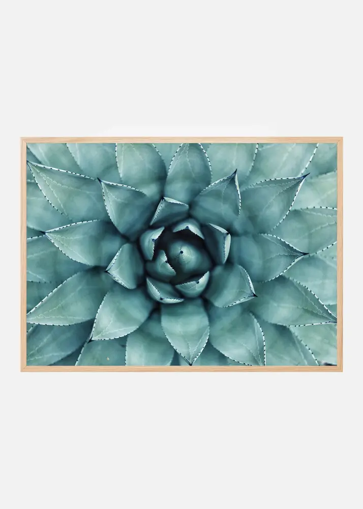 Póster gráfico con un primer plano hermoso de un cactus verde azulado. La forma clara de las hojas con las espinas oscuras y el color turquesa apagado crean un diseño atractivo que se ve bien en cualquier tipo de decoración. Con un marco oscuro como enmarcado, la fotografía se ve bien en la pared por sí sola, pero también se puede usar como parte de una colección de imágenes con plantas.