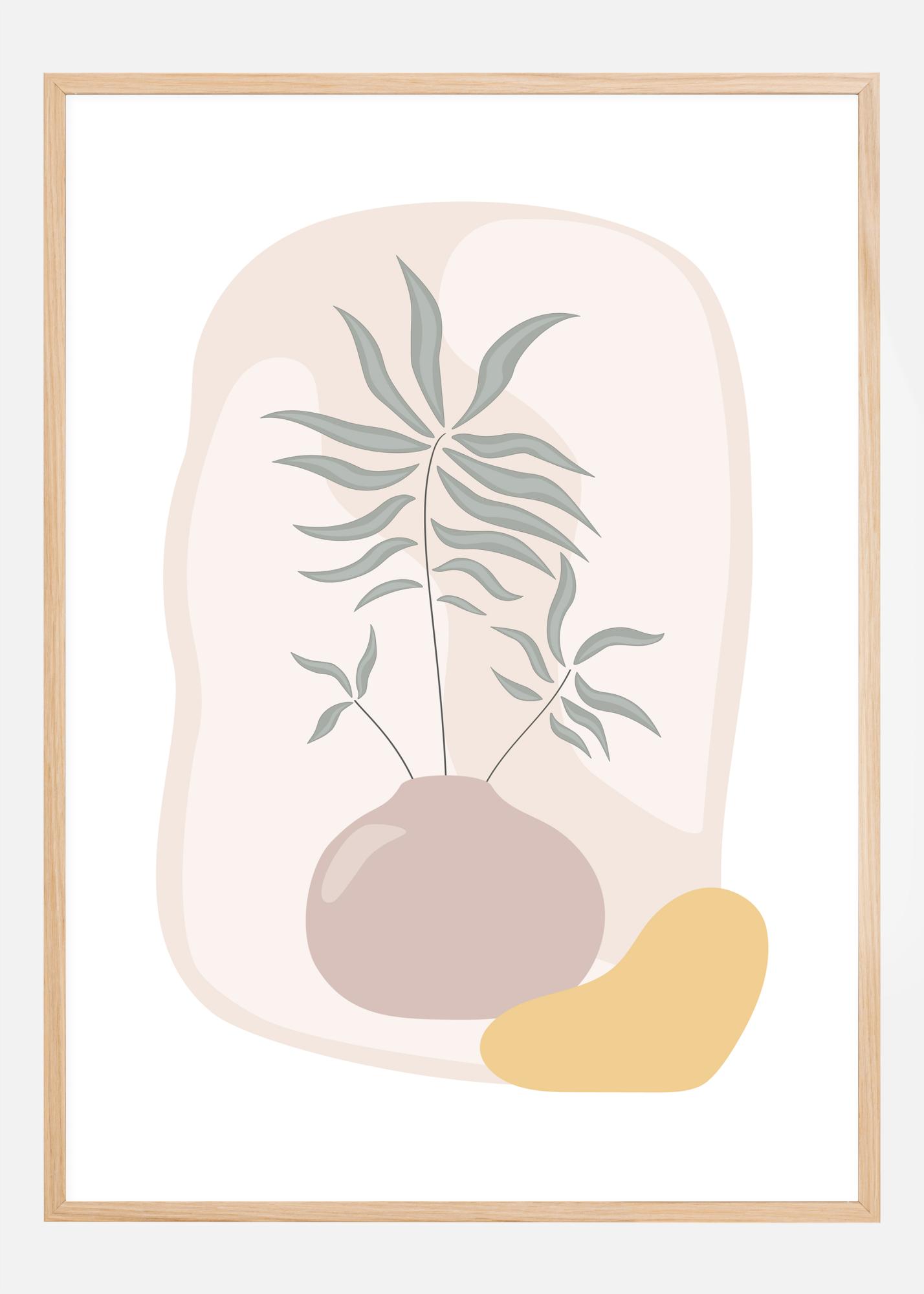 Un póster elegante con un jarrón con una planta verde que sobresale de él. Otras formas y colores extraños llenan el fondo y hacen de esto una obra interesante pero algo abstracta. Combínalo con un dibujo en un estilo similar para crear tu propia mini galería en casa.