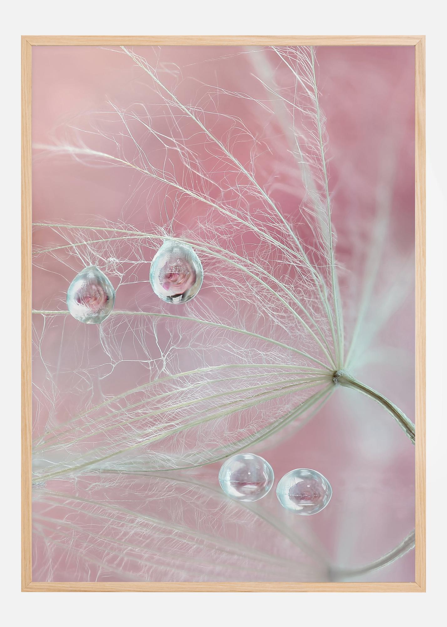 Un elegante póster con una corola de flor en forma de araña, con dos gotas de agua en los delicados extremos en forma de plumas. Un fondo rosa claro brilla a través de cada una de las perfectas gotas de agua mientras cuelgan justo antes de caer de la flor. Disfruta del delicado equilibrio de la naturaleza.