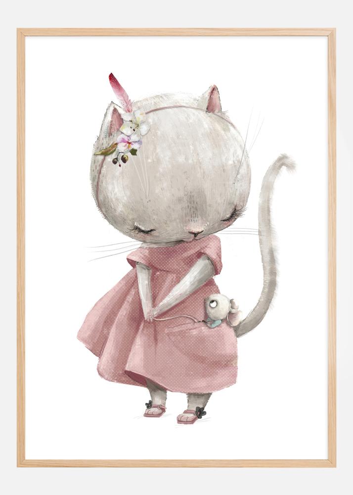 Este adorable póster muestra una dulce escena de una amistad inusual; un pequeño ratón que descansa tranquilamente en el regazo del gato, ambos vestidos con ropa festiva. El gato está elegantemente vestido con un vestido rosa, completo con una elegante decoración floral en la cabeza. La hermosa pintura en acuarela proporciona a los animales una suavidad y calidez que irradia amistad y confianza.
