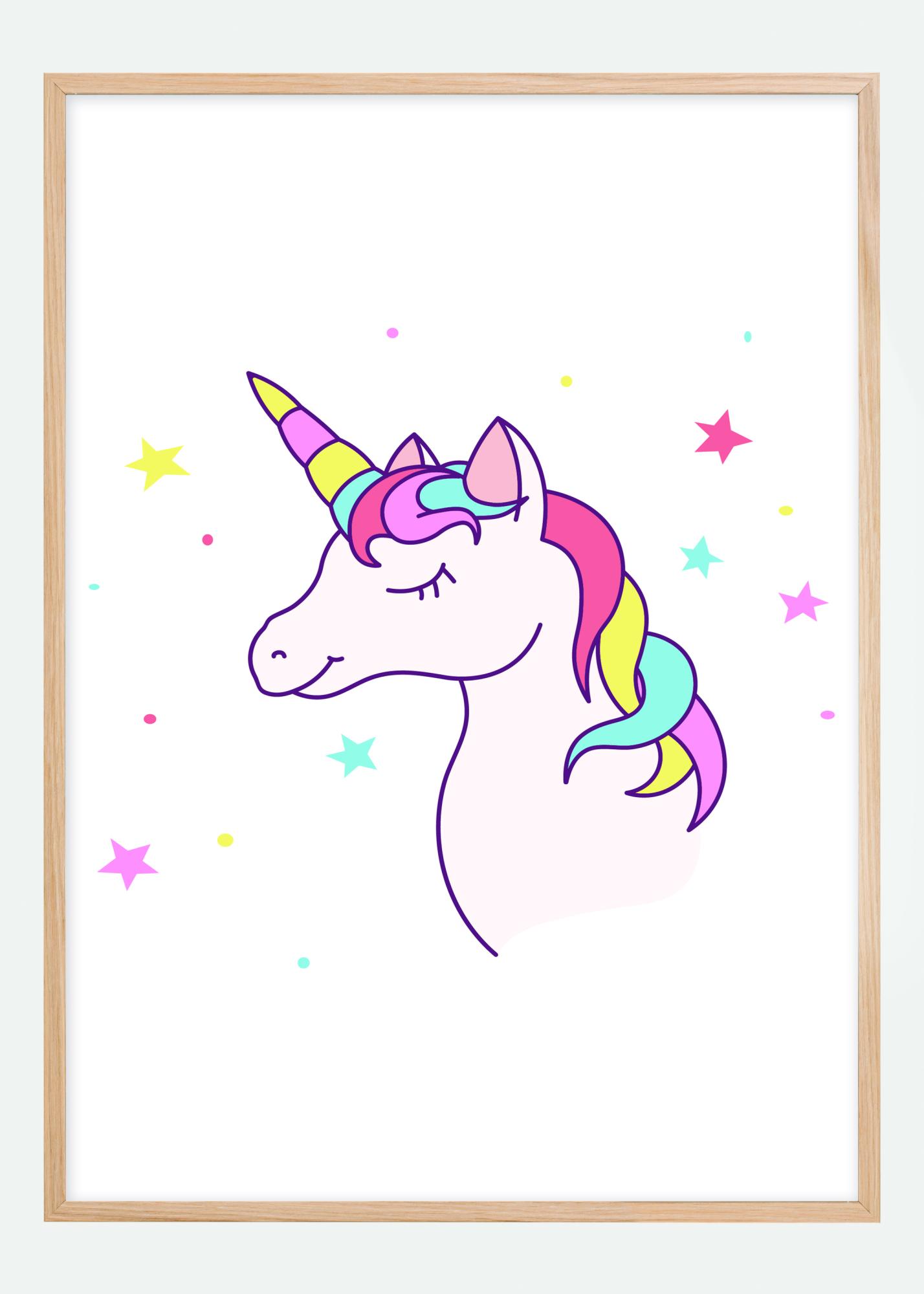 Un ingenioso póster con un unicornio con los ojos cerrados sobre un fondo blanco. El unicornio tiene una melena y un cuerno amarillo, azul y rosa. También hay estrellas en los mismos colores dispersas detrás, creando una imagen mágica y linda. Es perfecto para una habitación infantil, ya que es un dibujo sencillo y divertido.