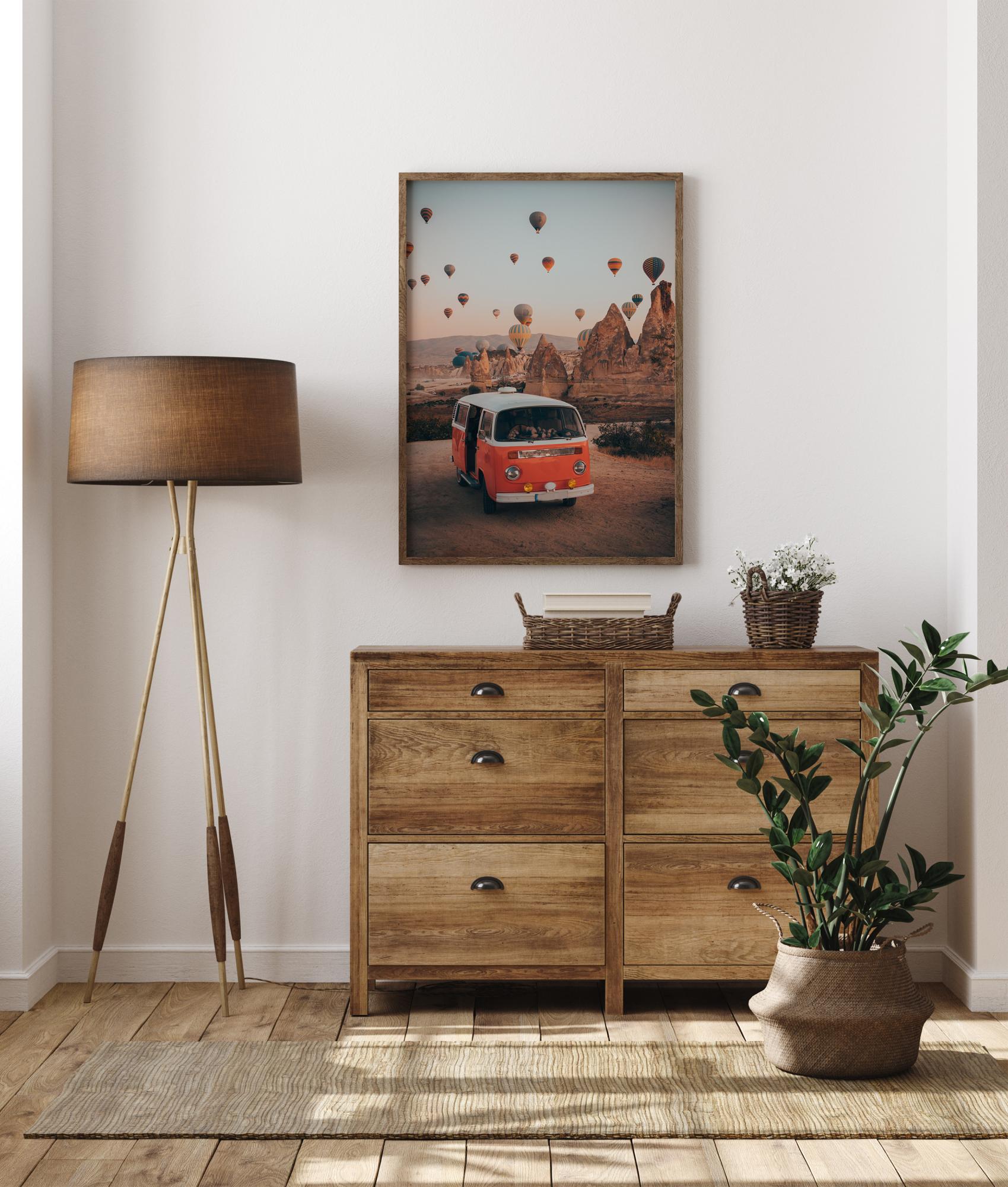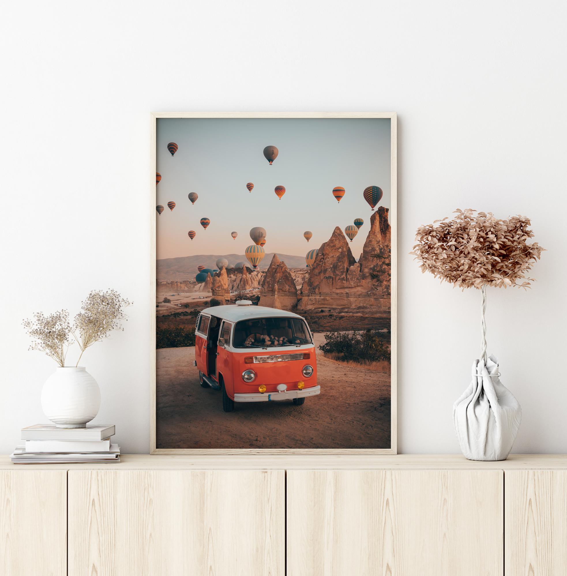 Un paisaje con formaciones rocosas interesantes y globos aerostáticos volando sobre la cima. Una furgoneta Volkswagen naranja con la puerta abierta está en primer plano. Los coloridos globos llenan el cielo detrás mientras se elevan hacia el cielo azul claro para un viaje mágico.