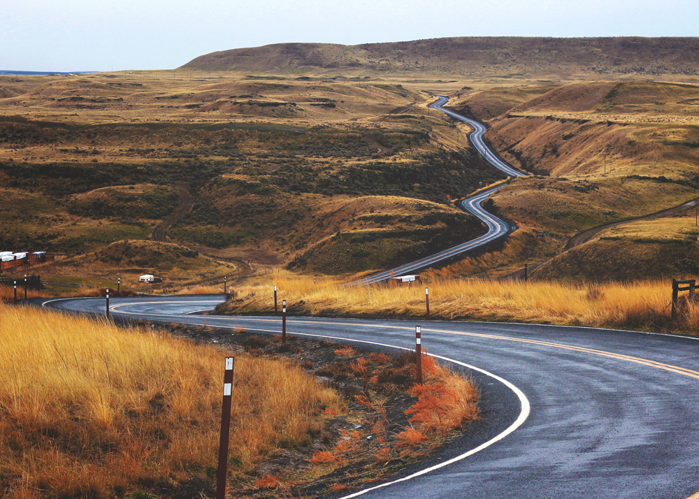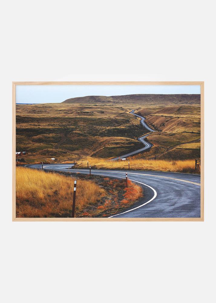 Póster con una carretera de asfalto que serpentea a través de un paisaje estepario quemado por el sol. Los tonos de hierba amarillo marrón contrastan con la fría superficie del asfalto que se abre paso a través del paisaje abierto, atrayendo la mirada hacia la imagen y siguiendo el camino. El póster se adapta bien a un marco minimalista donde el motivo puede lucir y puede combinarse con otras pinturas para crear un tema.