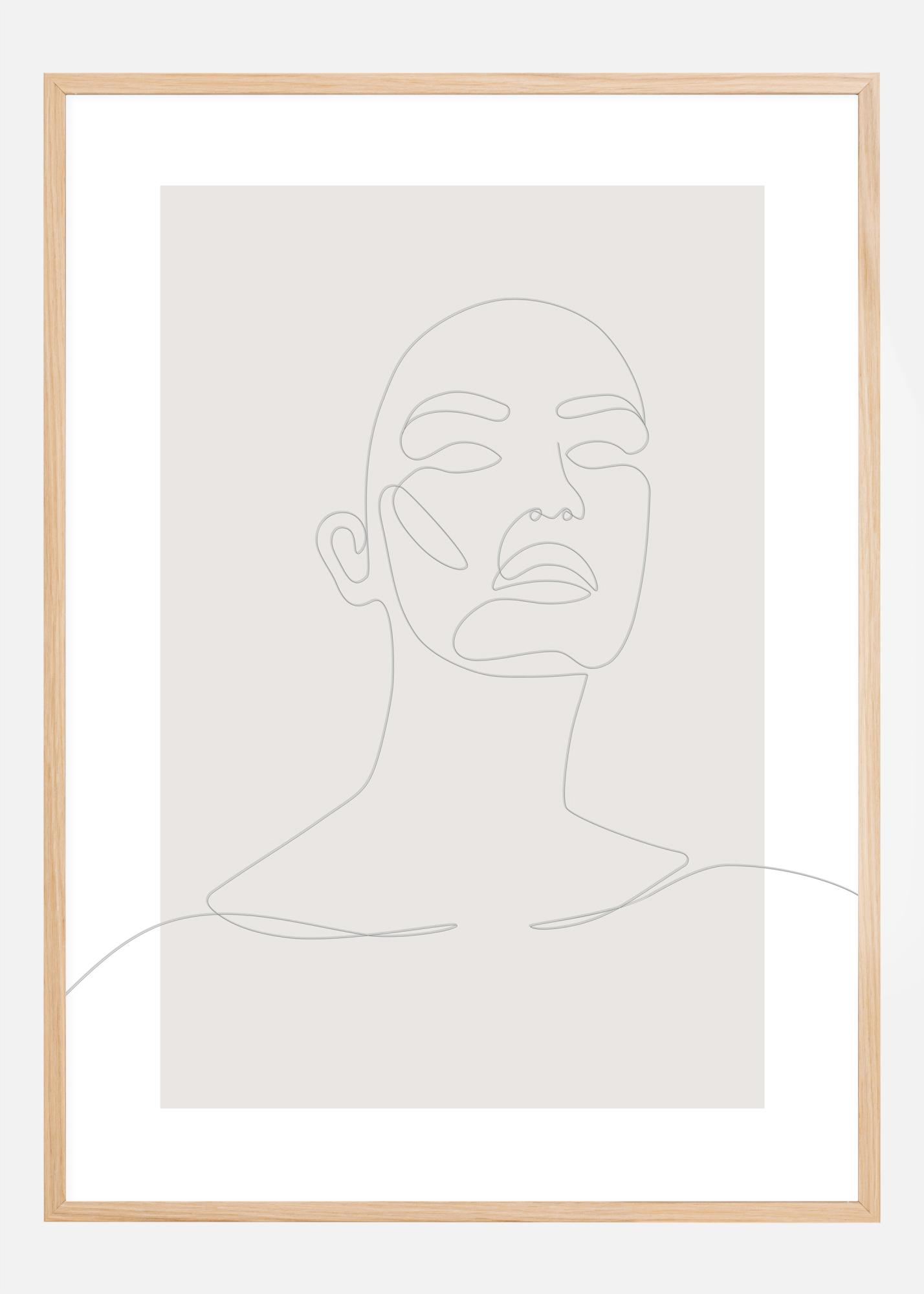 Un póster de retrato abstracto único con un rostro compuesto por una sola línea. La fina línea negra se mueve sin esfuerzo a lo largo de la página para crear un rostro completo en un solo trazo. El suave fondo gris asegura que observes detenidamente la imagen para apreciar todos los detalles.
