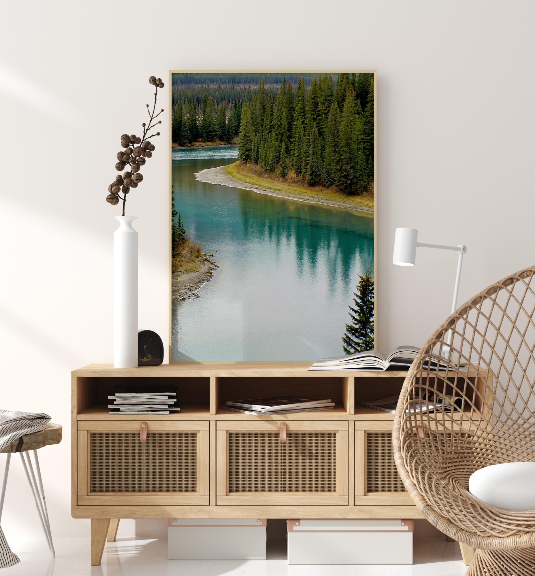 Un paisaje forestal donde los pinos bordean la orilla de un amplio río que serpentea a través del campo. Los árboles verdes se alzan altos mientras el bosque desaparece en la distancia. El amplio río está casi en colores del arco iris y captura las altas y puntiagudas reflexiones de los árboles en su superficie.
