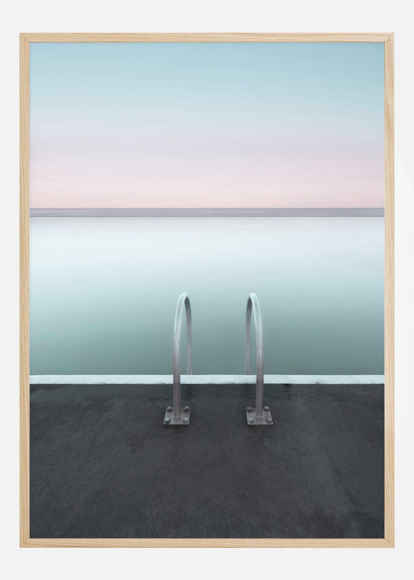 Un póster de colores pastel con asas para escaleras de piscina que se extienden sobre el borde de una plataforma hacia un vasto mar azul. Las asas son tentadoras y te animan a seguirlas sobre el borde hacia el amplio agua azul. En el fondo se puede ver un cielo suavemente rosa pálido cuando la luz del amanecer temprano llega.