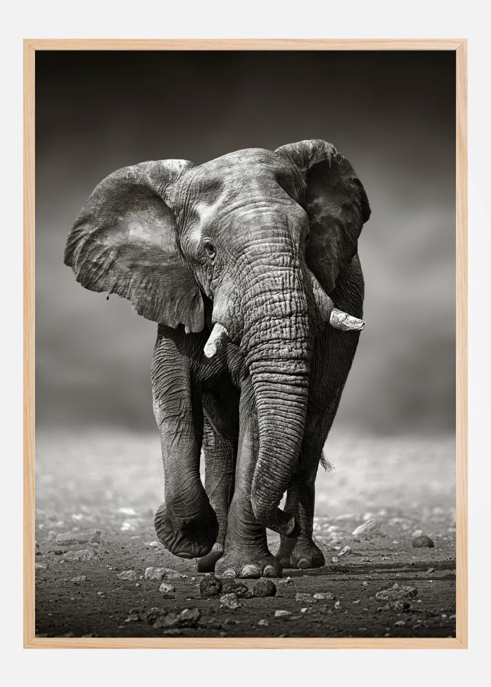 Un magnífico póster con un elefante en blanco y negro. El elefante está en medio de su paso mientras se mueve hacia la cámara. Parece joven con colmillos blancos cortos y una expresión tranquila en su rostro. Visita África mientras admiras esta imagen colgada en tu hogar.