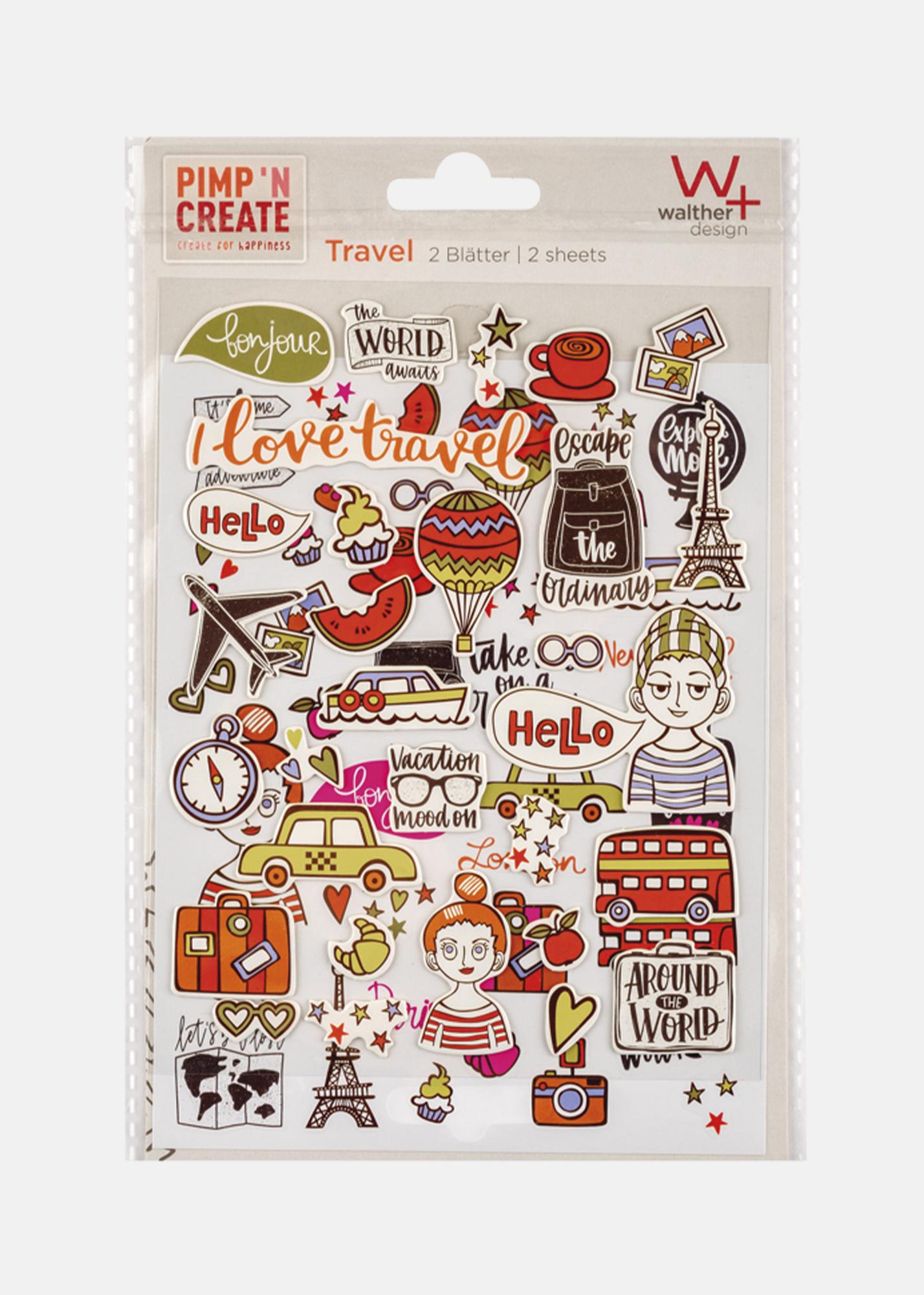 Pegatinas autoadhesivas con motivos de viaje. Perfectas para el diseño creativo de álbumes de fotos, para decorar regalos o para crear tarjetas de felicitación. El paquete incluye 1 hoja de pegatinas en 3D y 1 hoja de pegatinas planas.