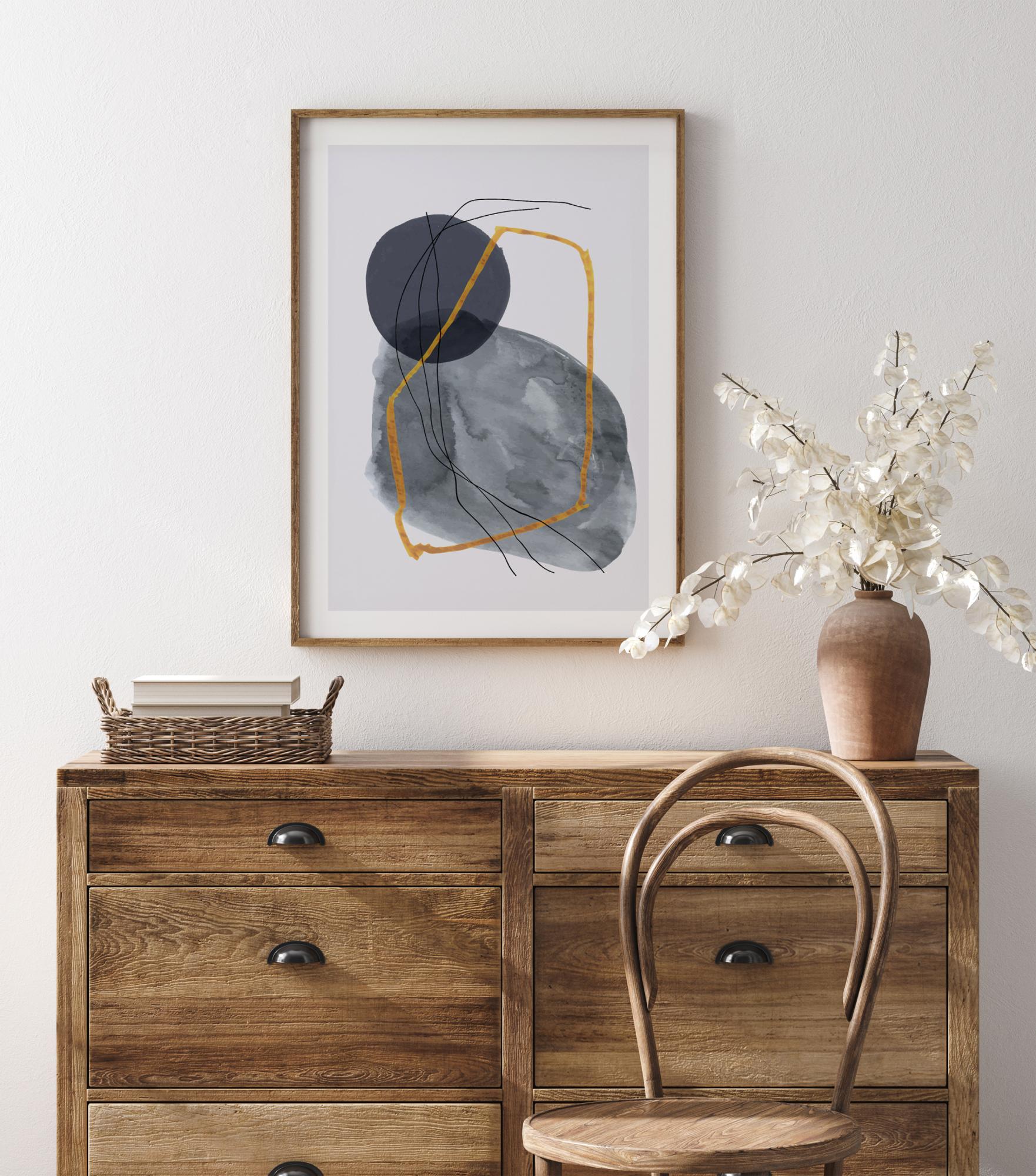 Un póster geométrico con diferentes formas azules sobre un fondo gris. Una gran forma azul pintada llena la pantalla con un círculo gris suave encima de ella. Líneas negras serpentean a través y hay una línea dorada gruesa que crea una tercera forma en la parte superior para una imagen única e interesante.