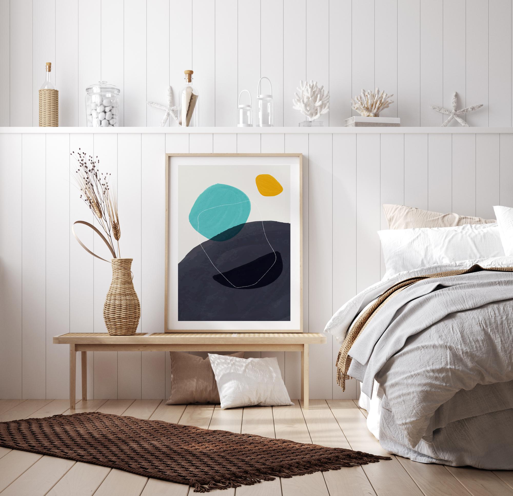 Un póster abstracto y colorido con formas extrañas en diferentes colores. La mayor parte de la imagen está llena de una forma gris curvada. En la parte superior hay un círculo azul claro con una pequeña forma redonda naranja. Líneas blancas y una forma de media luna negra se superponen a la gran forma gris. Descubre tu crítico de arte interno con esta imagen única.