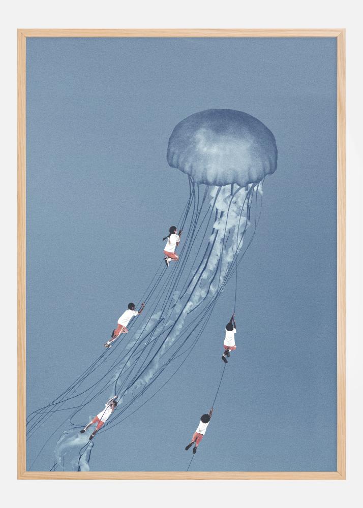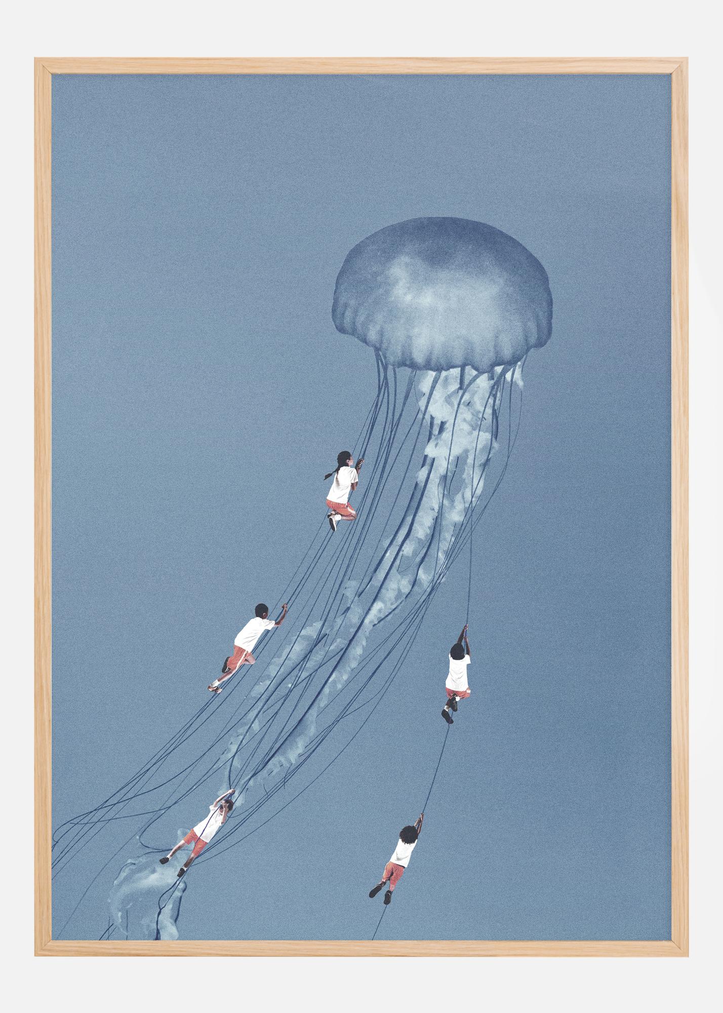 Este póster poético y onírico muestra a personas balanceándose en los tentáculos de una medusa gigante, flotando en un cielo azul infinito. Esta fascinante escena es un homenaje al poder de la imaginación, donde el subconsciente y el mundo de los sueños chocan con la realidad despierta. La danza ingrávida de las personas con la medusa simboliza alegría, libertad y la ligereza espontánea que a menudo se encuentra en los mundos lúdicos de los niños.
