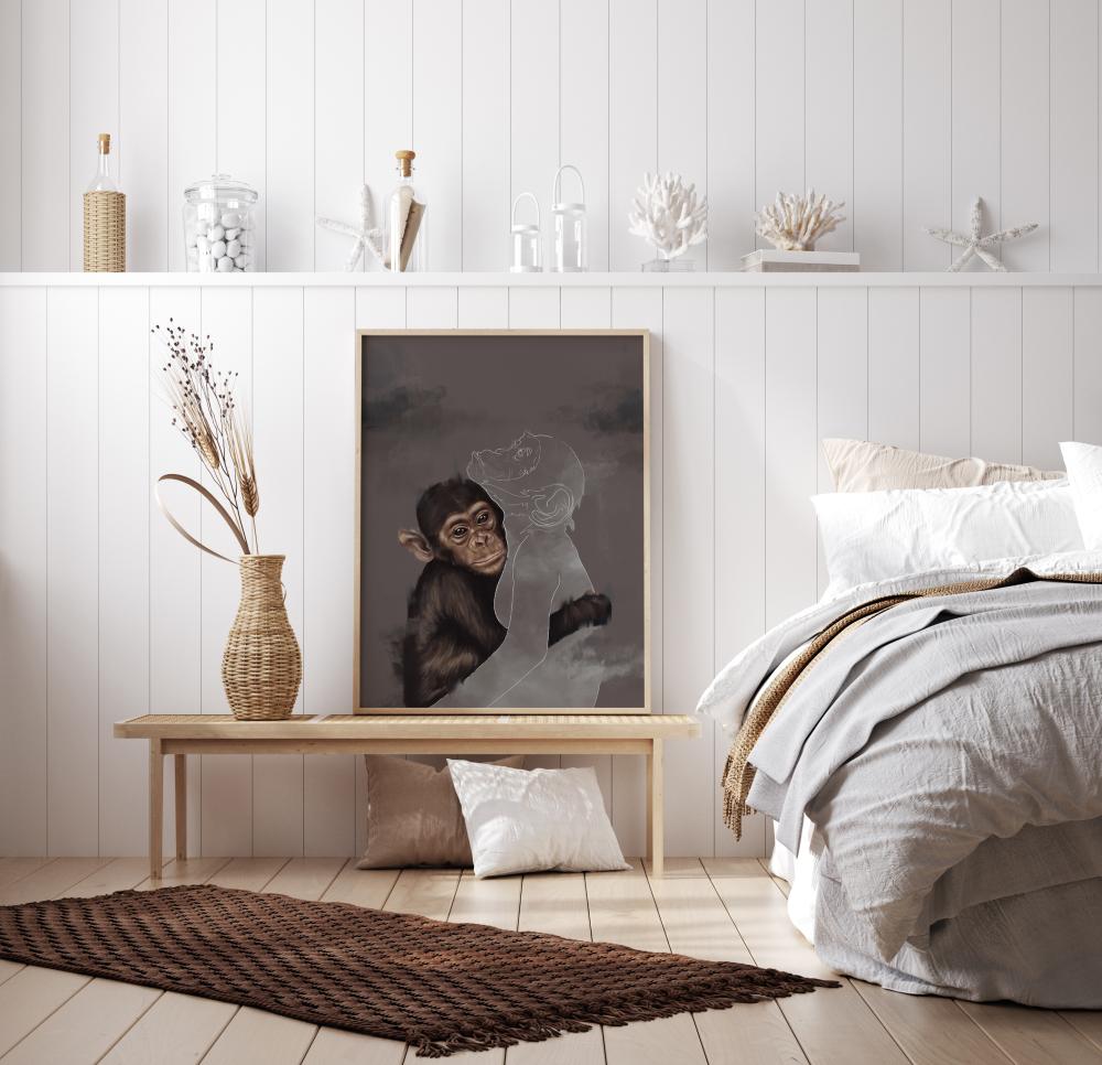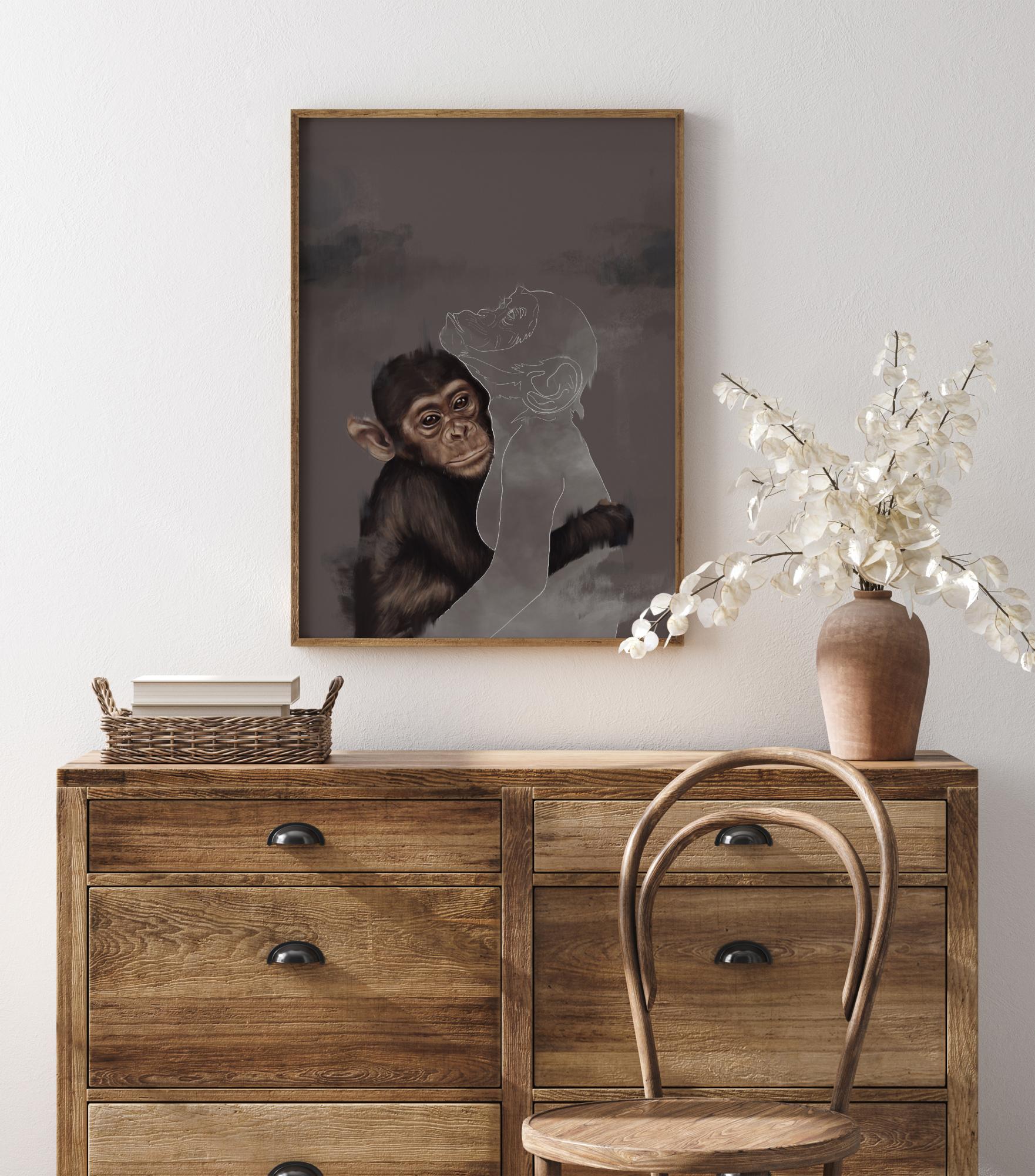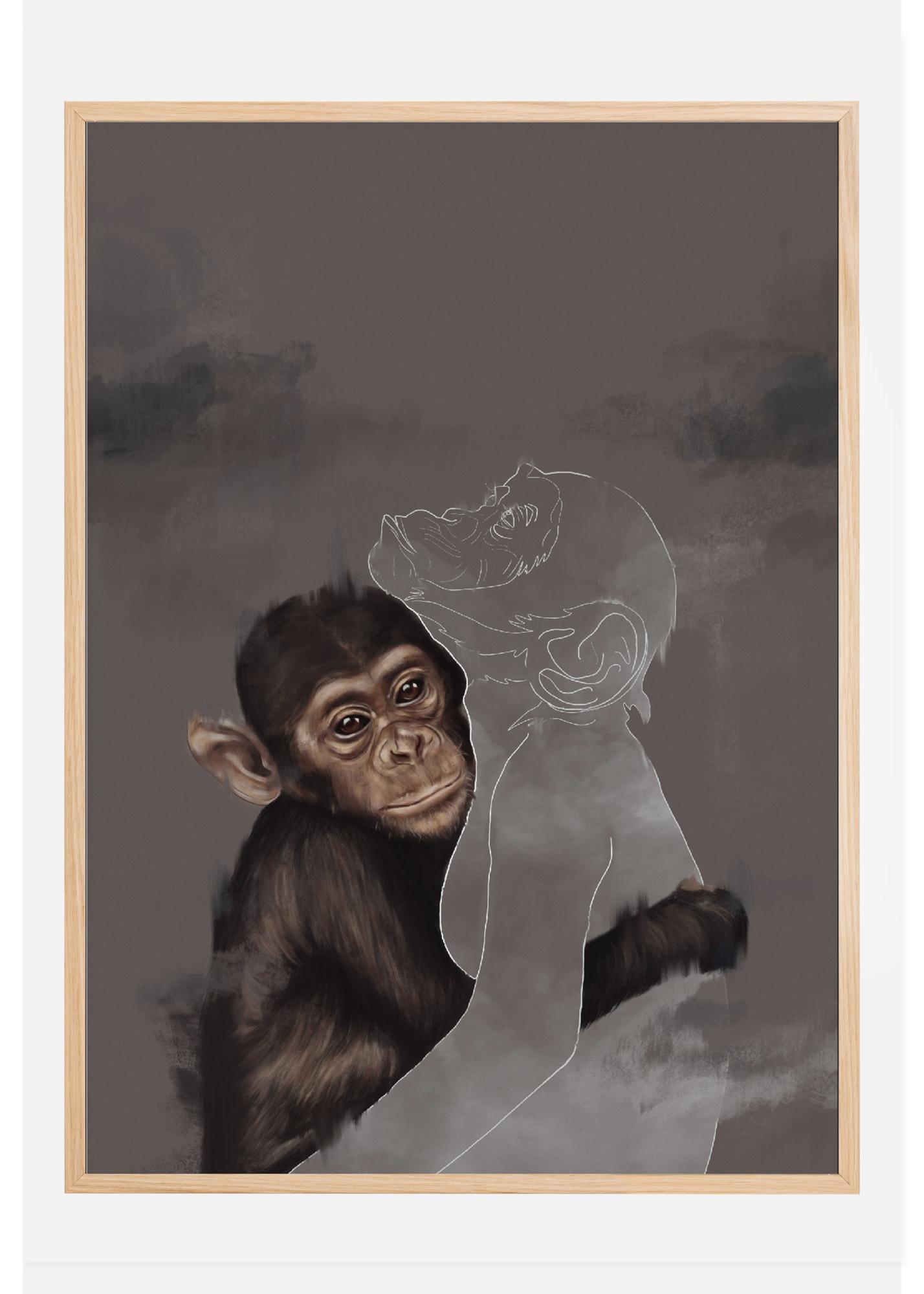 Un fantástico póster con un joven chimpancé abrazando a otro chimpancé en contorno. Esta imagen emocional tiene una pintura detallada de un chimpancé envolviendo su brazo alrededor del contorno blanco de otro chimpancé. El otro está ausente, entonces ¿dónde está el otro mono y por qué ya no está allí?