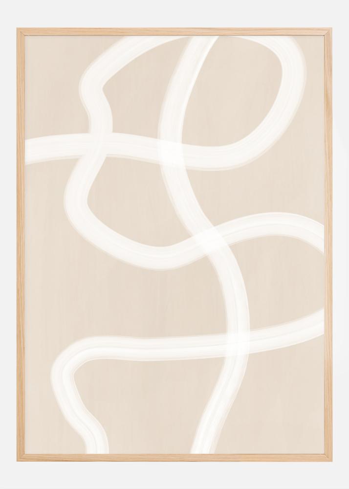 Los trazos blancos ondulantes de este póster contra un fondo beige cálido ofrecen una estética cautivadora y contemporánea. Sus líneas fluidas y formas orgánicas generan una sensación de movimiento y espontaneidad, al mismo tiempo que mantienen una sensación depurada y limpia típica del diseño minimalista moderno.
