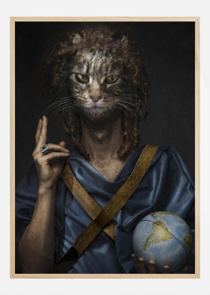 Este cartel único muestra una imagen peculiar y provocativa donde la cabeza de un gato ha sido colocada en una figura humana. El motivo presenta un fondo oscuro y profundo que contrasta fuertemente con la mirada clara y aguda de la figura. La parte humana de la figura está vestida con una túnica azul rica, bordeada con detalles dorados que aportan una sensación de elegancia y fuerza. La mano de la figura sostiene un globo terráqueo antiguo, lo que añade una dimensión de sabiduría y percepción mundial. En la imagen dominan colores como azul profundo, oro, así como tonos de marrón y beige que se fusionan para crear un póster que es tanto místico como icónico.
