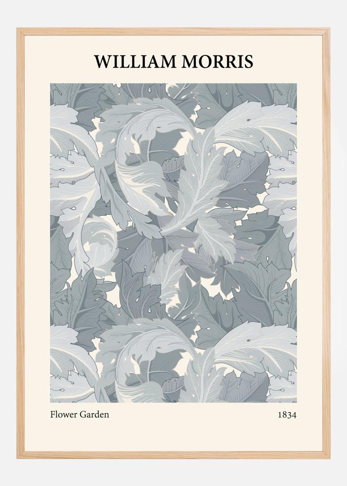 Este póster, con su exuberante y sofisticado motivo de William Morris, ofrece una sensación de calma y elegancia clásica. El diseño es una oda a la abundante vegetación que a menudo se asocia con Morris y su trabajo dentro del movimiento Arts and Crafts. El motivo, denominado "Flower Garden", incluye una composición densa de hojas y flores, representadas en tonos fríos de azul y gris con toques de crema. Cada detalle en este póster está cuidadosamente pensado, creando la sensación de un jardín virtuoso y ordenado.