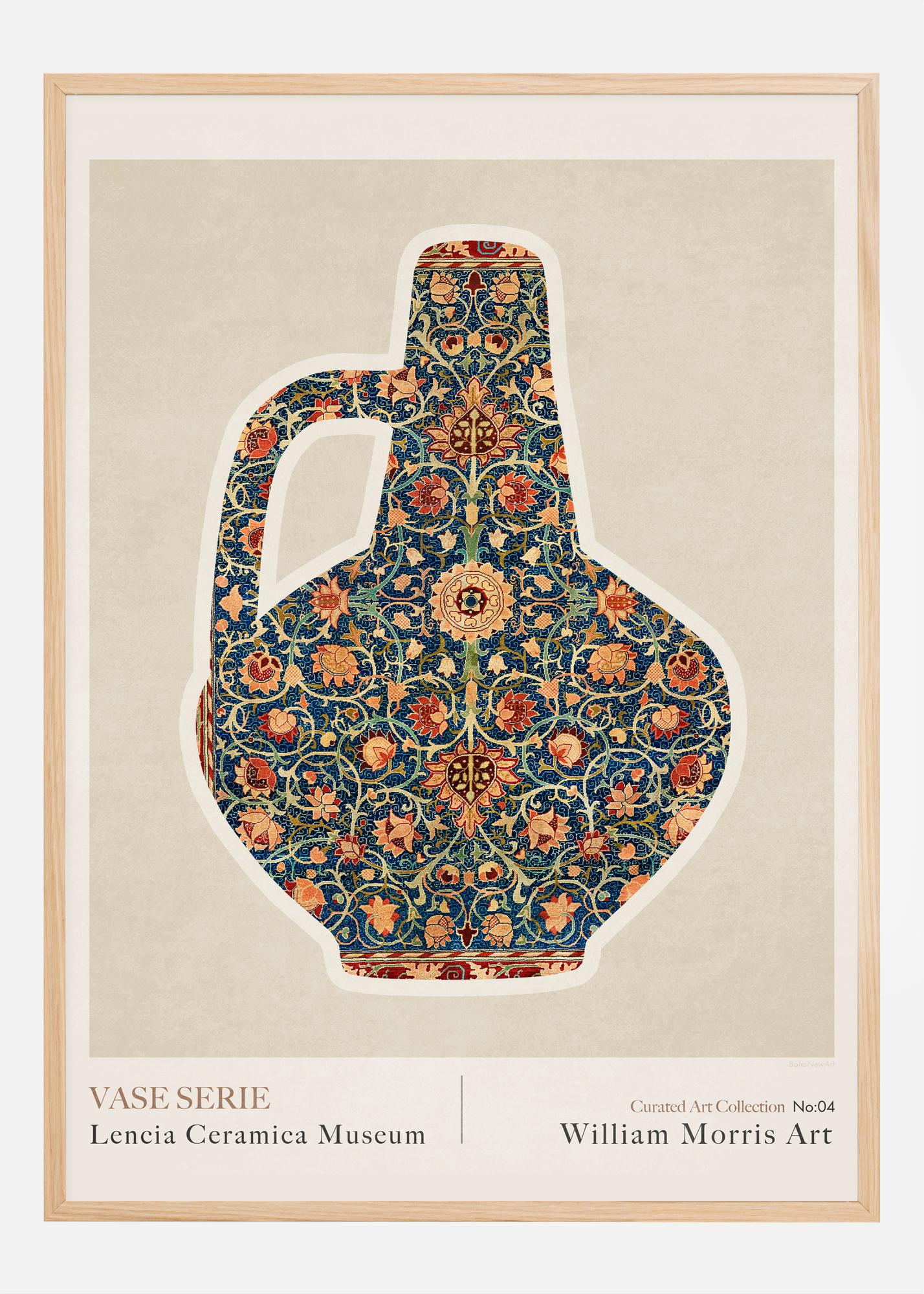 Este póster, que es el número 04 de la "Curated Art Collection" del Museo Lencia Ceramica, es un homenaje rico y complejo a William Morris y su contribución significativa al arte del diseño. Aquí se presenta un elegante jarrón, cubierto por un patrón detallado y colorido que emana la fascinación de la era victoriana por el arte oriental y medieval, un estilo que Morris ayudó a popularizar.