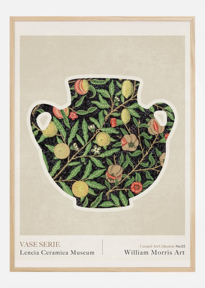 En este póster, número 05 de "Curated Art Collection" en el Museo Lencia Ceramica, revivimos la influencia atemporal de William Morris en el arte y el diseño. La obra presentada es un jarrón estilizado con un diseño de patrones intrincados que está lleno de una fascinante mezcla de elementos botánicos y motivos frutales, lo que refleja la pasión de Morris por lo natural y su capacidad para entrelazar las formas de la naturaleza en su trabajo.