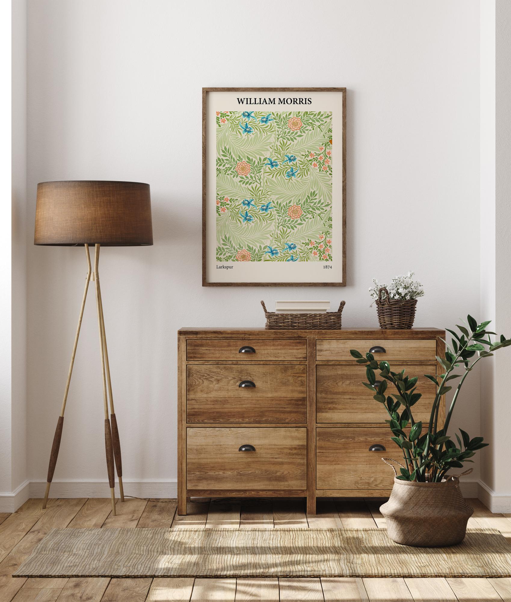 Un póster clásico con una impresión de William Morris de espuelas de caballero. Los suaves colores pastel de melocotón, azul y verde hacen de esta una impresión divertida para colgar en la pared. Disfruta del diseño repetitivo y siéntete calmado por los suaves colores que esta impresión contiene.
