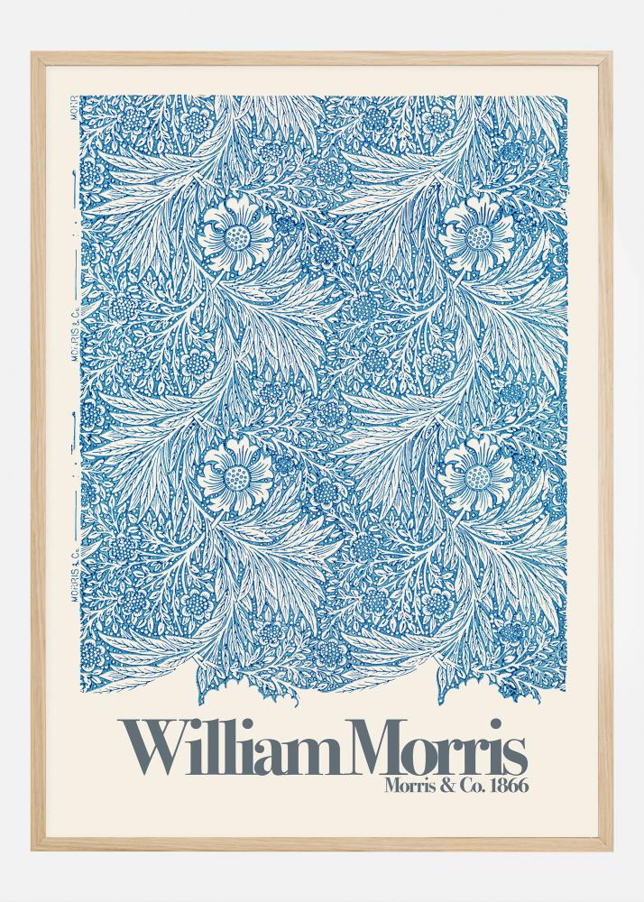 Este póster muestra un diseño clásico de William Morris llamado "Marigold", creado por Morris & Co. alrededor de 1866. El patrón icónico, conocido por sus elementos intrincados e inspirados en la naturaleza, está realizado en un color azul profundo sobre un fondo de crema limpio. Cada detalle en el arreglo floral está cuidadosamente elaborada, mostrando el sentido de Morris por la belleza en lo natural y la capacidad de transformarlo en obras de arte que son atemporales y queridas hasta hoy.
