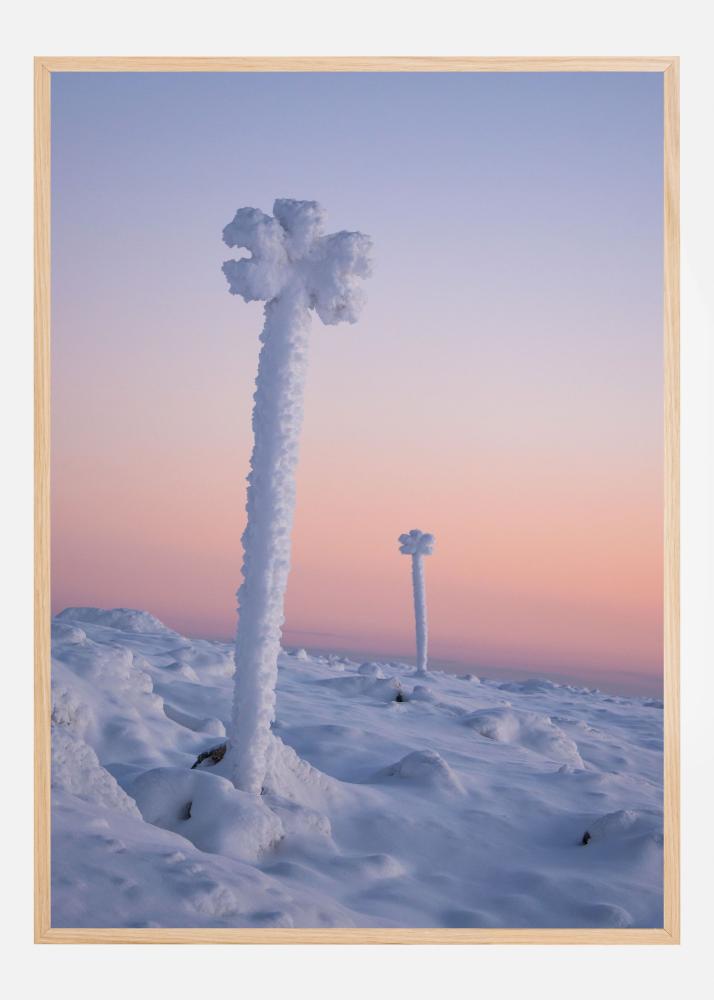 Este póster muestra un paisaje invernal de ensueño, donde formaciones cubiertas de nieve se alzan sobre un campo de nieve suave y ondulado. El motivo transmite tranquilidad y minimalismo, con pilares cubiertos de escarcha que casi parecen esculturas naturales. El cielo presenta una hermosa transición de colores que aporta a la imagen una expresión serena y poética, perfecta como lámina o cartel para quienes desean crear una atmósfera armoniosa y moderna en casa.
