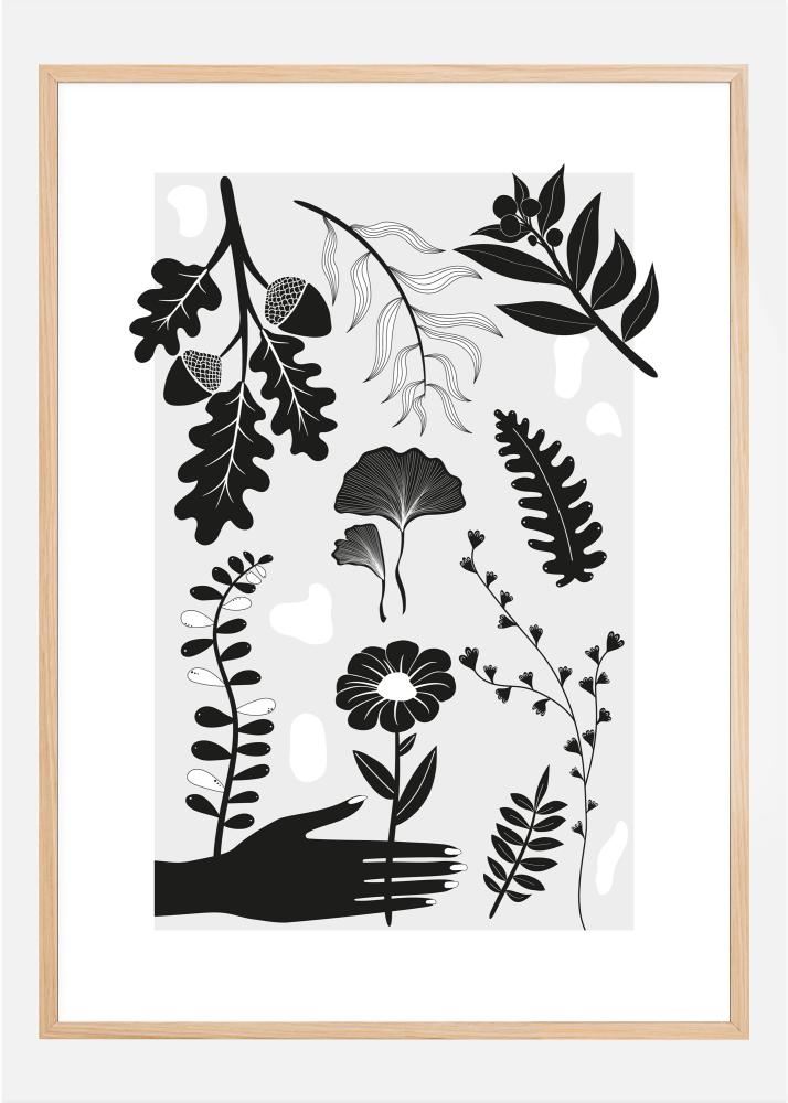 Un audaz póster con figuras en blanco y negro de diferentes hojas, plantas y flores. Una mano negra se extiende para agarrar una de las flores estilizadas. Bellotas, flores, helechos y más llenan esta lámina sencilla pero interesante. Ponte de humor botánico al colgar este póster de plantas en tu hogar.